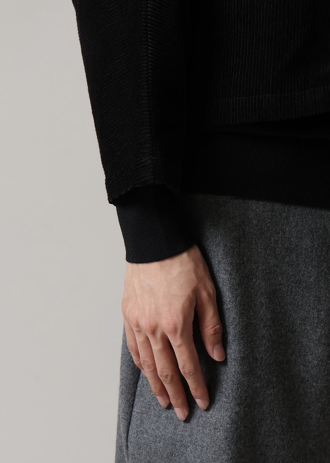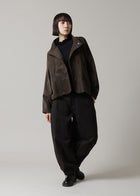存在感のあるスタンドカラーは、前を閉めて衿を立てて着用するとモードな雰囲気に。フロントを開けて着用することで、首周りもすっきりと着用いただけます。