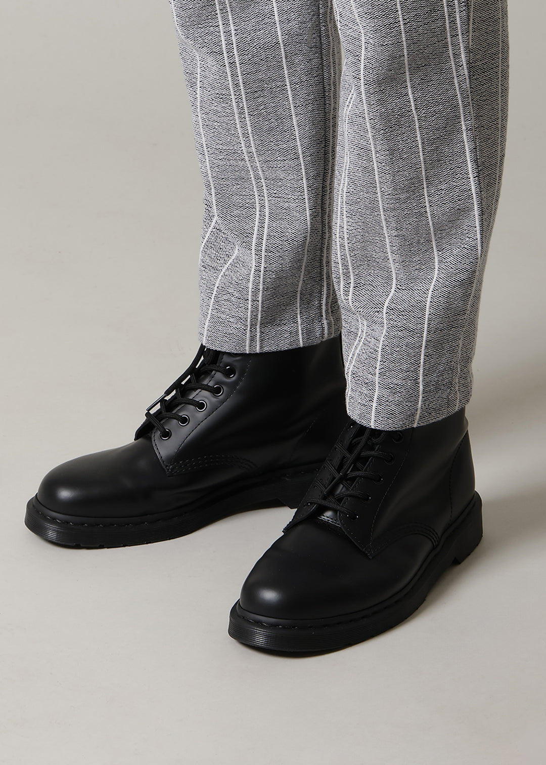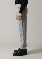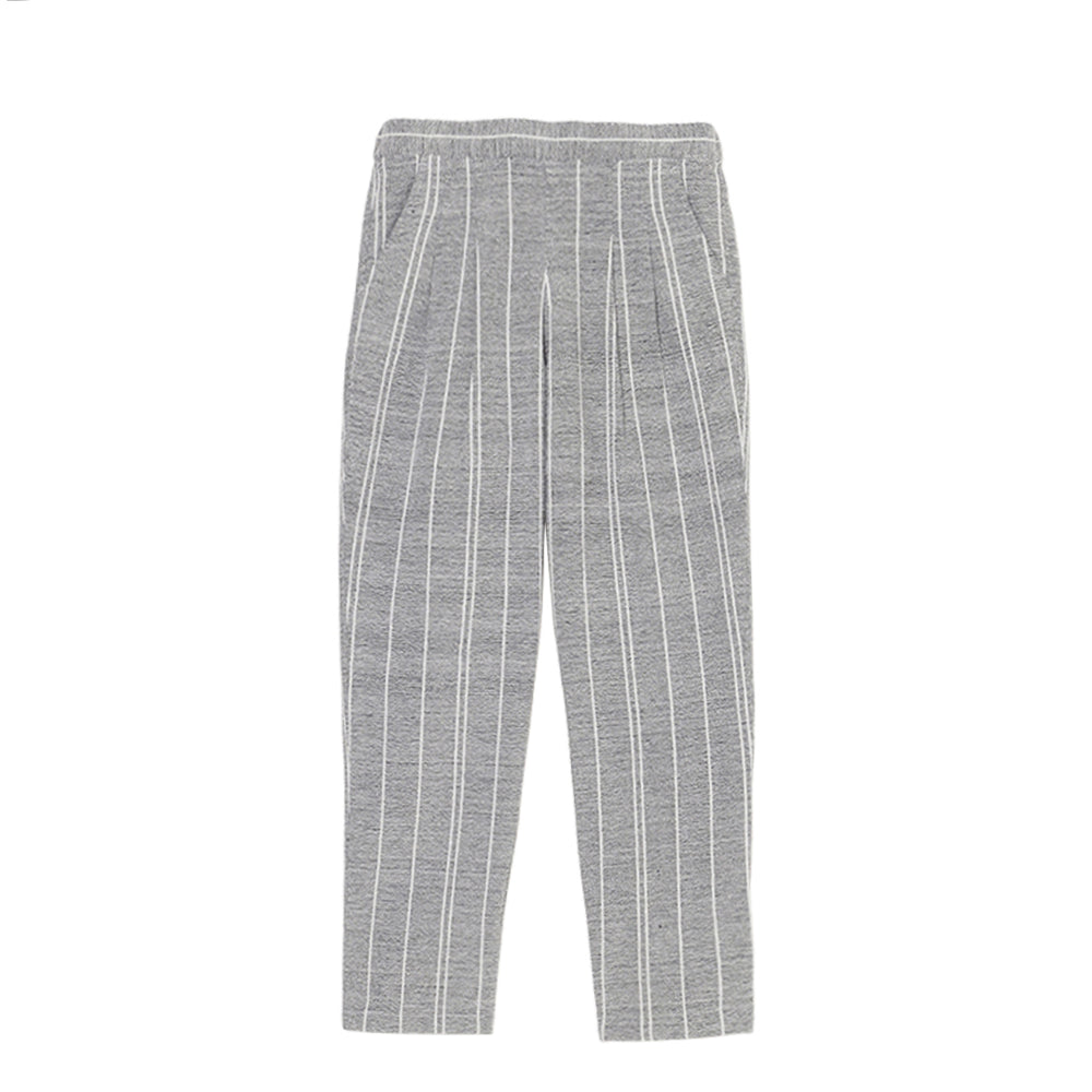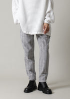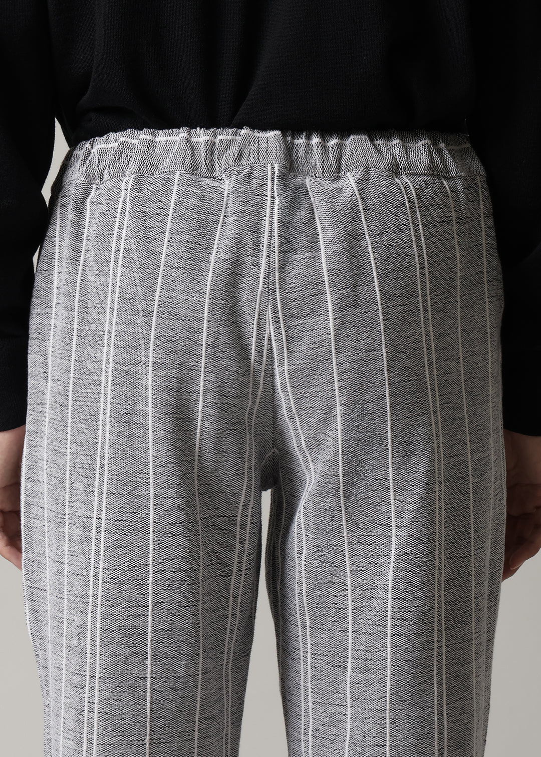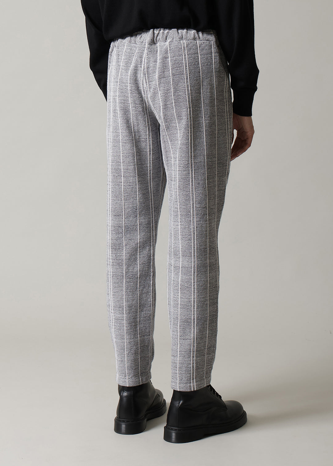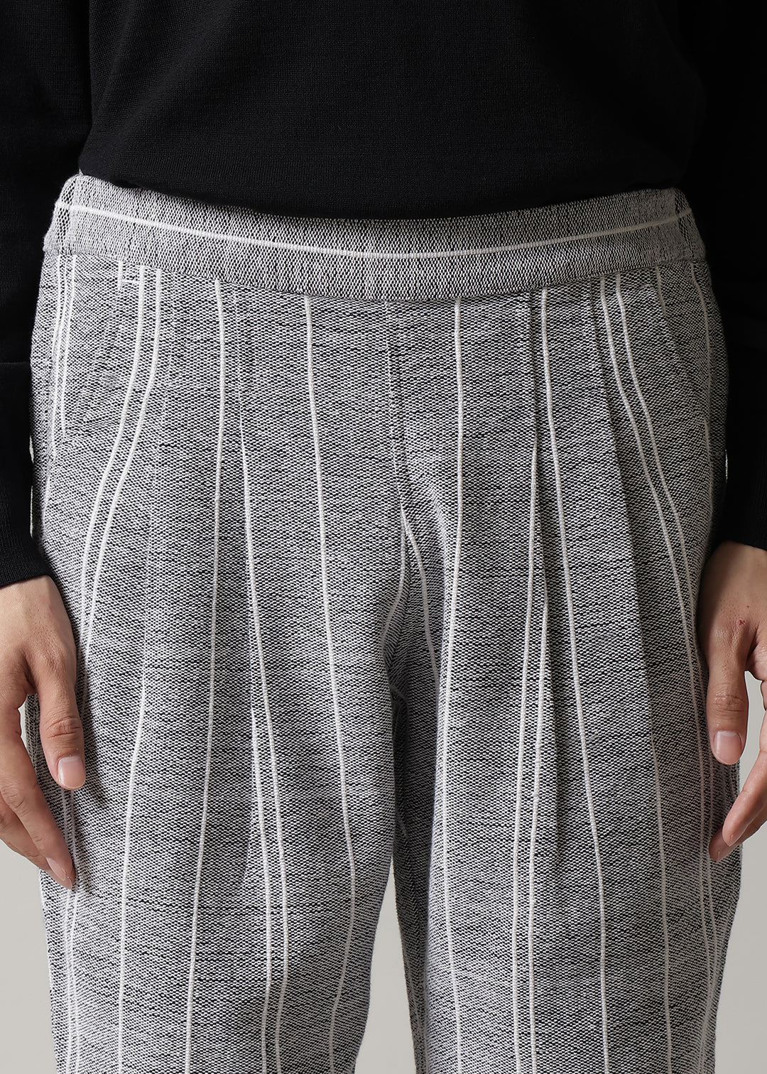 腰回りにゆとりがありつつ、裾に向かってストンと落ちるシルエットが、すっきりと上品な印象に。 白と黒の2色の糸で織られた立体的なストライプ柄がアクセントとなり、コーディネートに個性を加えます。