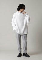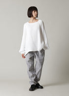 白と黒の糸をかけ合わせた、凹凸のあるストライプ柄が目を惹くコットン生地です。太さのある糸を使っているため生地自体に存在感があり、多くの糸を束のようにまとめて織ったストライプ部分の立体感がさらに独特の印象を生んでいます。 ある程度の厚みがありながらも、手織りのため肌触りは柔らかく、秋~初春まで長く活躍するマテリアルです。
