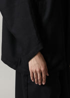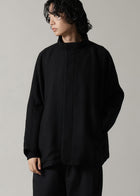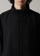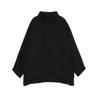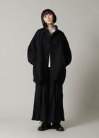 存在感のあるスタンドカラーは、前を閉めて衿を立てて着用するとモードな雰囲気に。フロントを開けて着用すると、首周りに抜け感がうまれすっきりと着用いただけます。