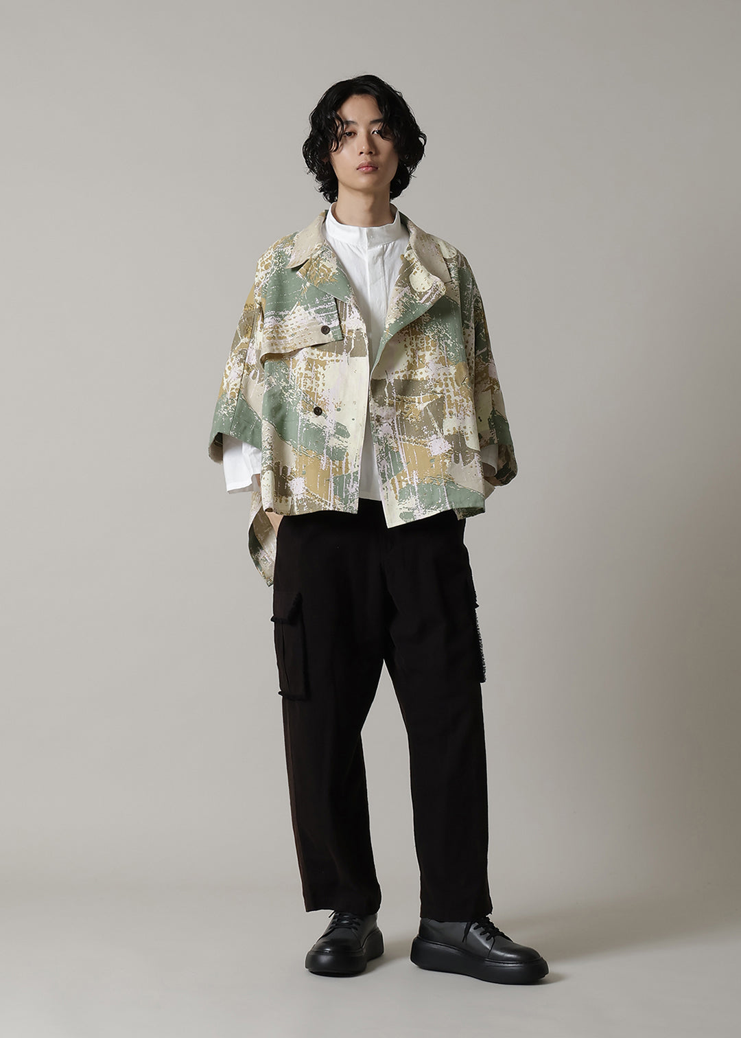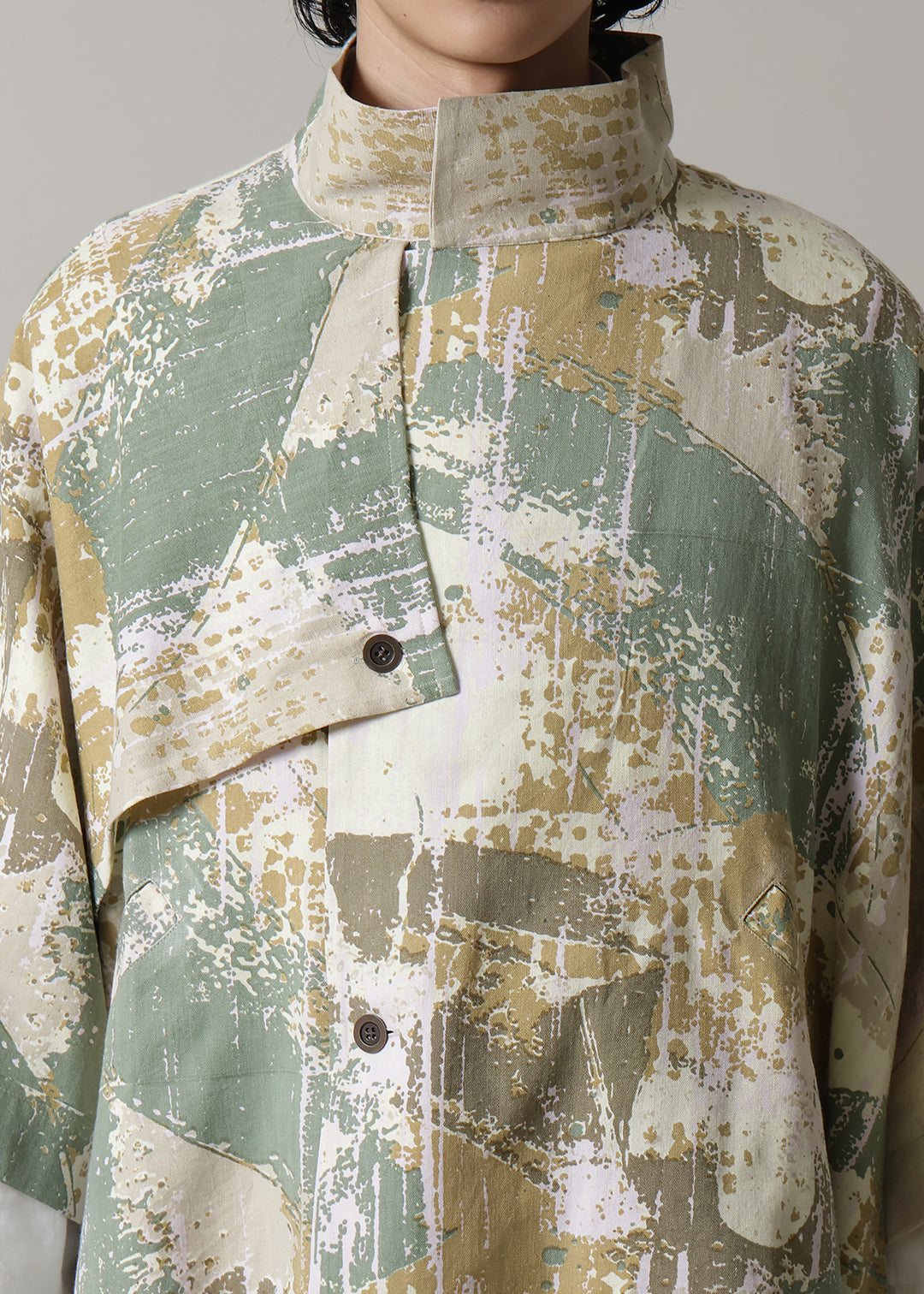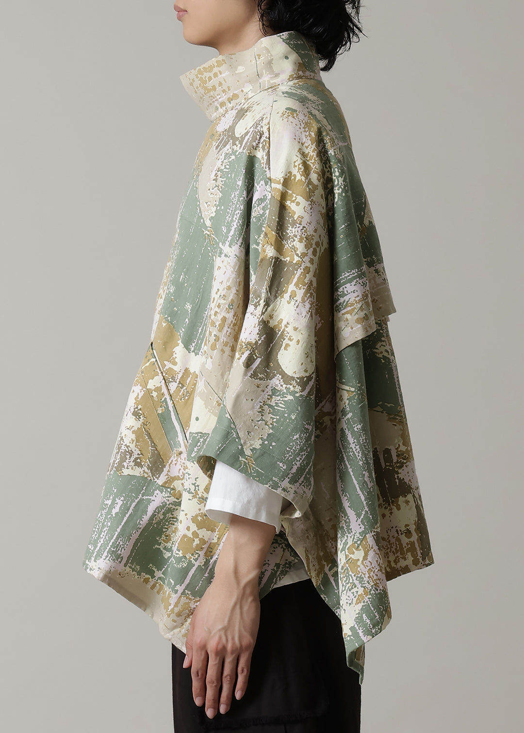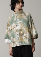 柔らかな色合いの幾何学的なスクリーンプリントが目を惹く、ユニセックスのショートコートです。