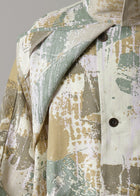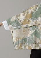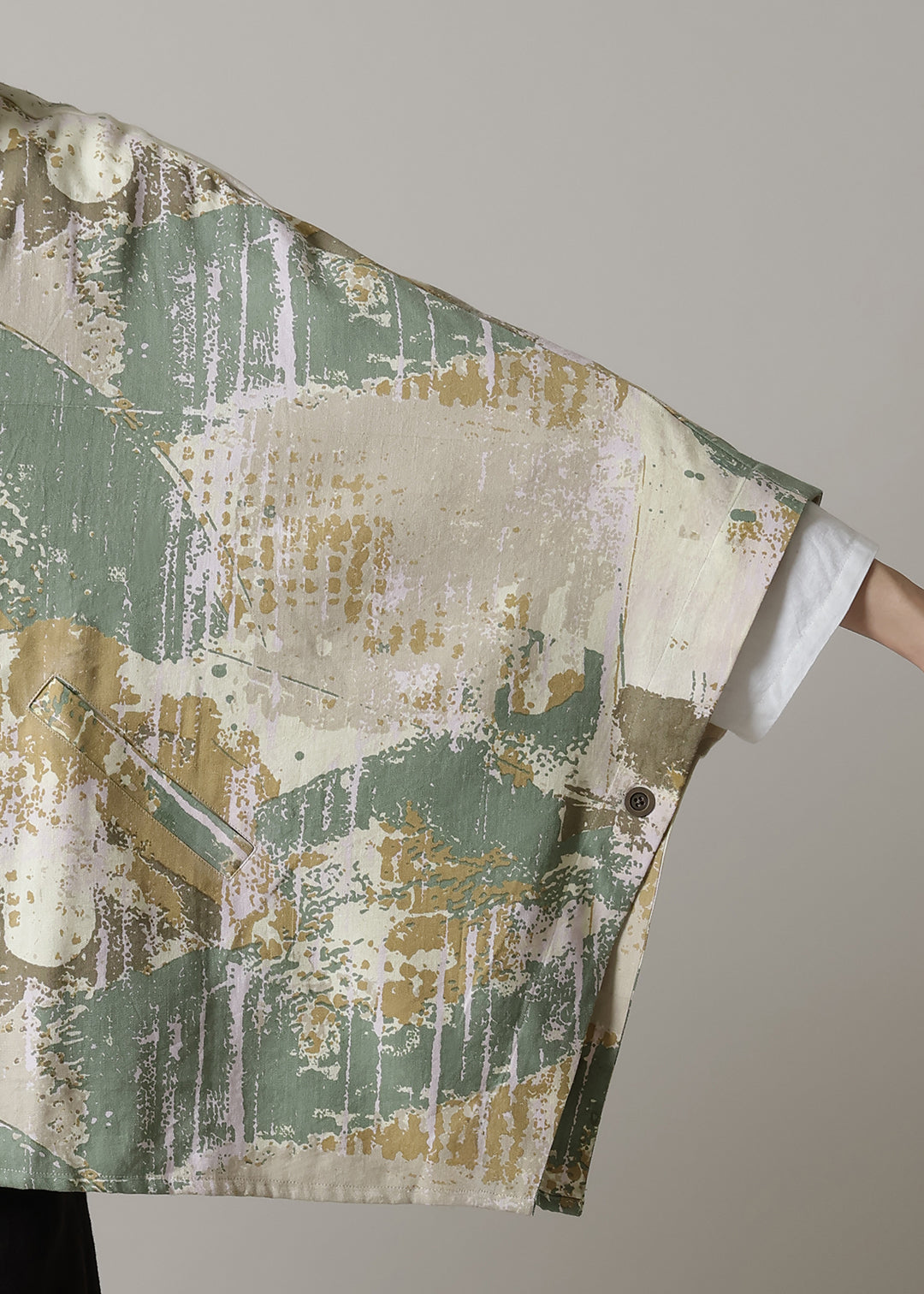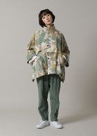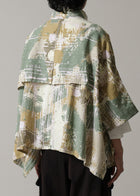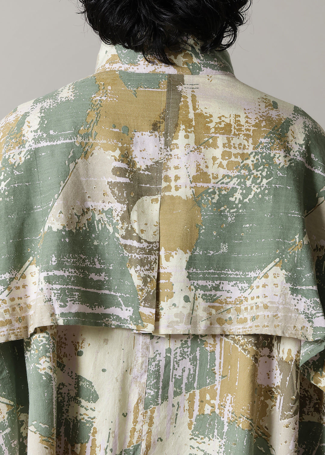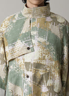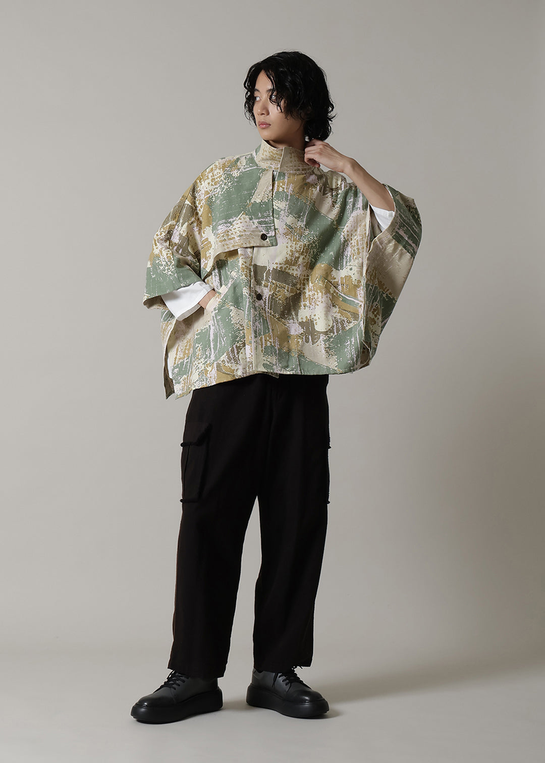 柔らかな色合いの幾何学的なスクリーンプリントが目を惹く、ユニセックスのショートコートです。