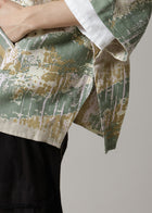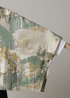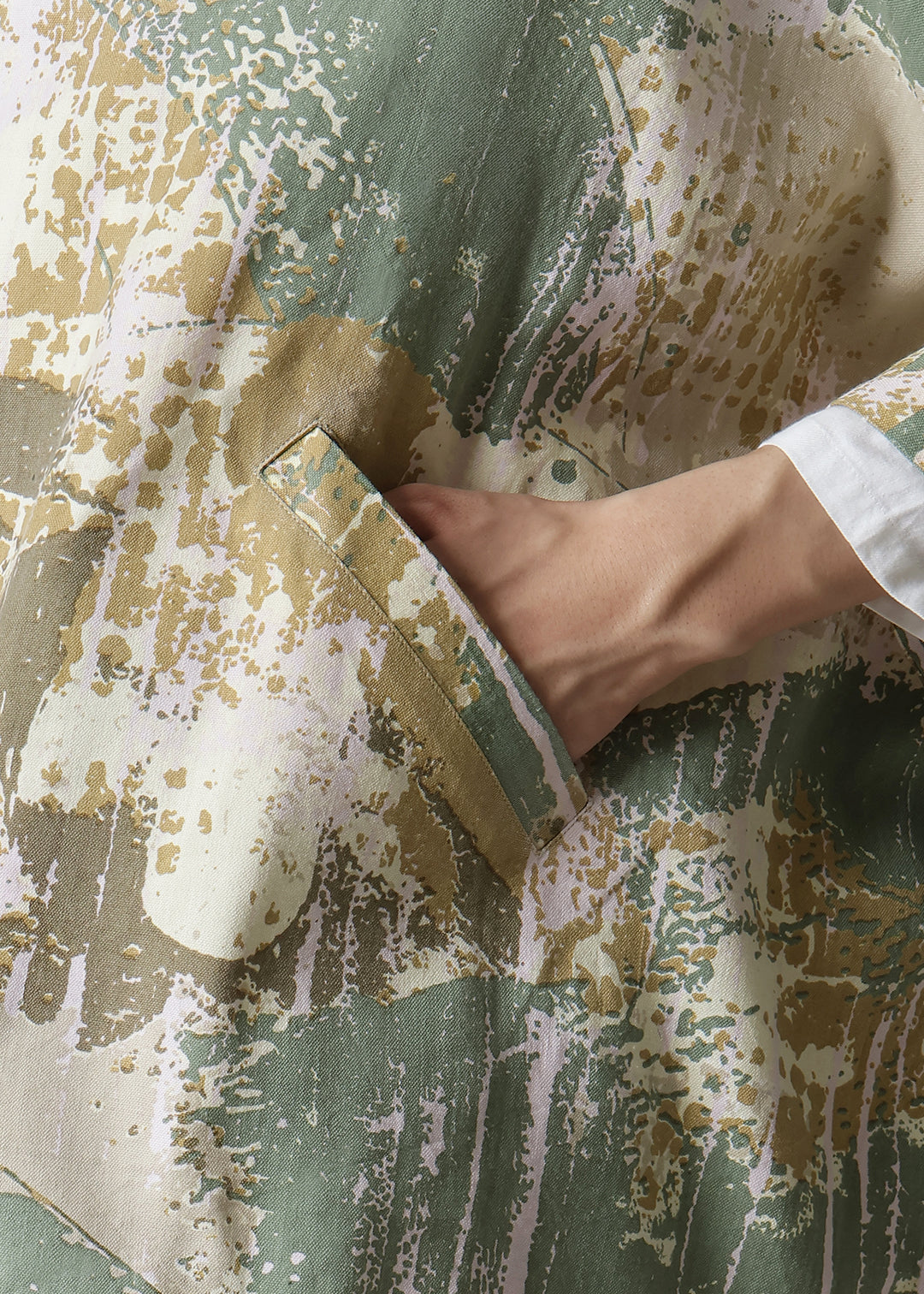 経糸に56番手のカディ糸、緯糸に40番手のモダール糸を組み合わせて手織りした生地です。モダールは、パルプを原料とするレーヨンの一種で、シルクのような滑らかな肌触りと上品な光沢感が特徴です。アースカラーを基調とした6色を組み合わせたスクリーンプリントは、自然で温かみのある印象を与えます。