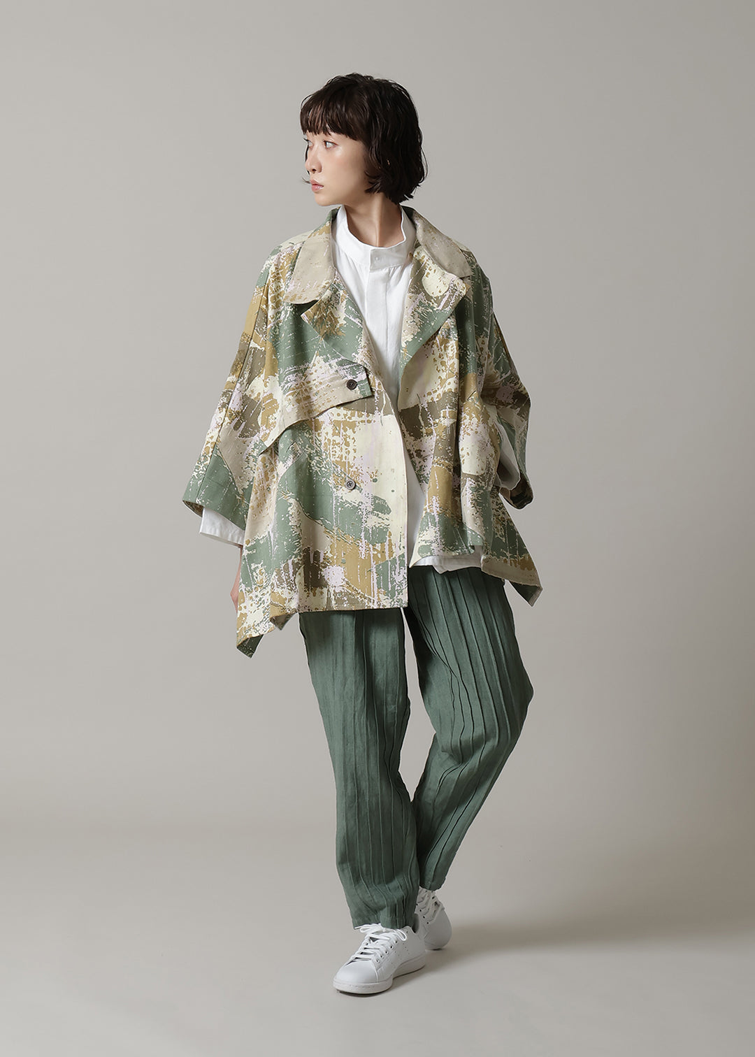 身頃のボタンの留め方次第で、シルエットの変化を楽しめるのも魅力的なポイント。ボタンを開ければよりポンチョ風に。留めればコートやジャケット風にと、様々な着こなしをお楽しみいただけます。