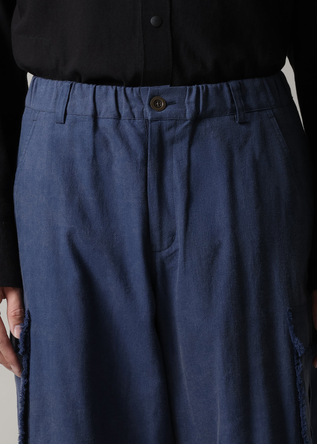 このパンツは、フロントはファスナー開きで、サイドと後ろのフラップにはフリンジをあしらいました。最初は少し細身のパンツでしたが、メンズも含めて1サイズで履けるように、幅をややゆったり目に仕上げています。