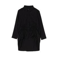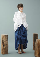 私は鞄の制作時から「紐」から生み出されることがよくあったため、その実験も活かせました。生地のたまり、歪み、集合をシャーリングで作ることで素材が、人体の上で遊んでいるように、またその様子が、着る人にとっても遊びや解放になったらいいなと思っています。