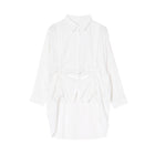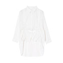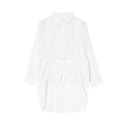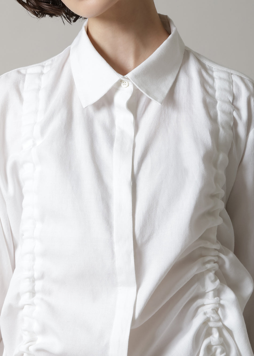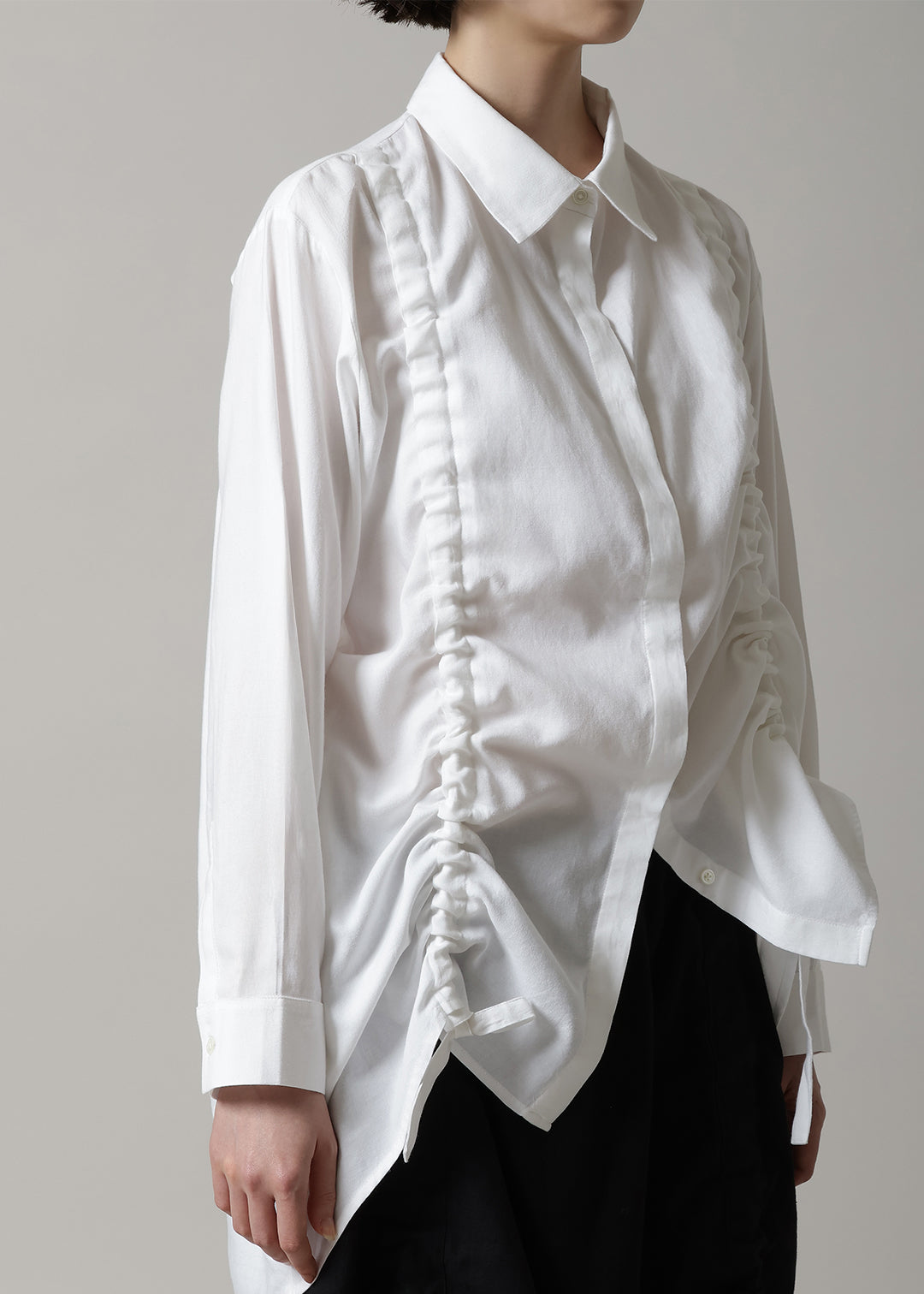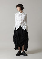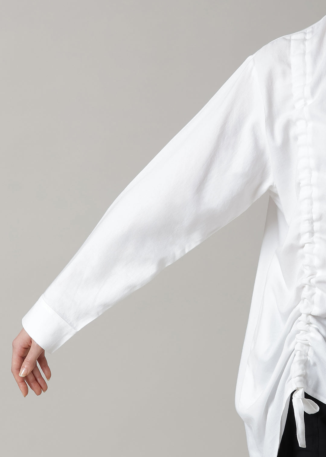 前身頃に入ったドロストリングが目を惹くデザイン。ギャザーを寄せることで軽やかな生地に立体感のあるシルエットが生まれます。