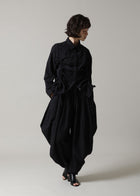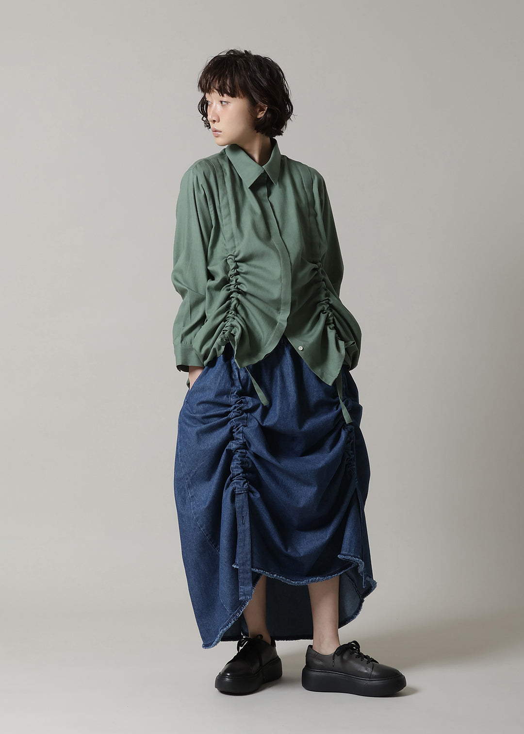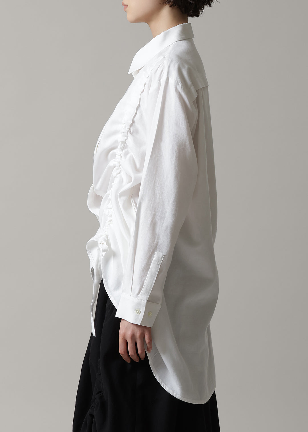 ギャザーを強く寄せた着こなしや、左右の寄せ具合を変えたり、あえてドロストリングを伸ばしてベーシックな着方もできるため、アレンジ次第でシルエットの変化も楽しめるのも魅力な一着。