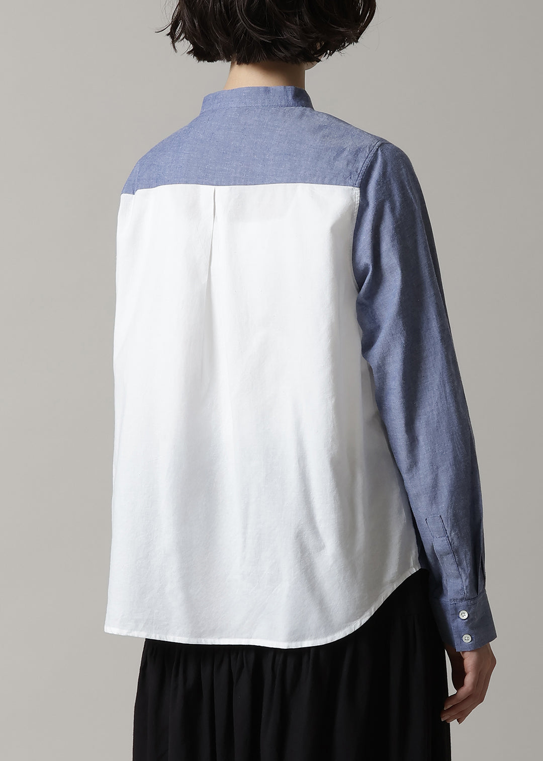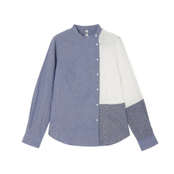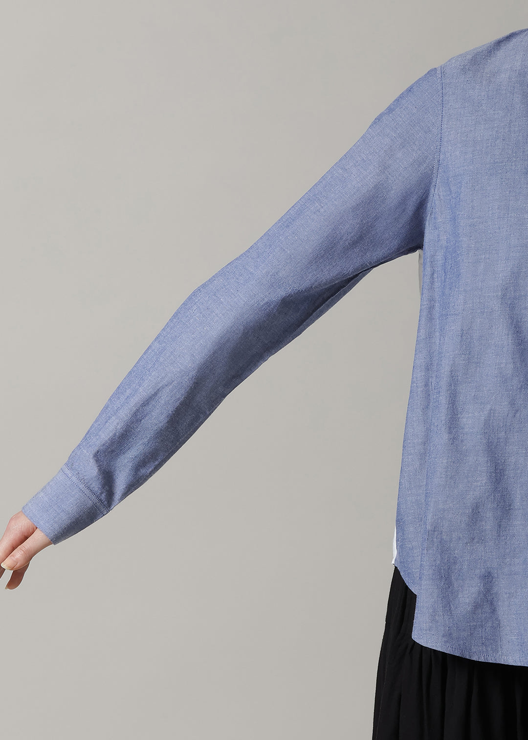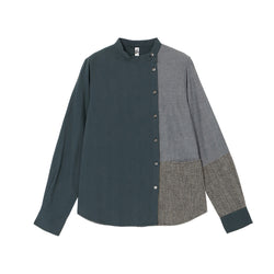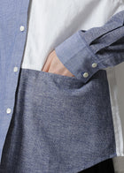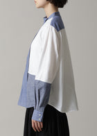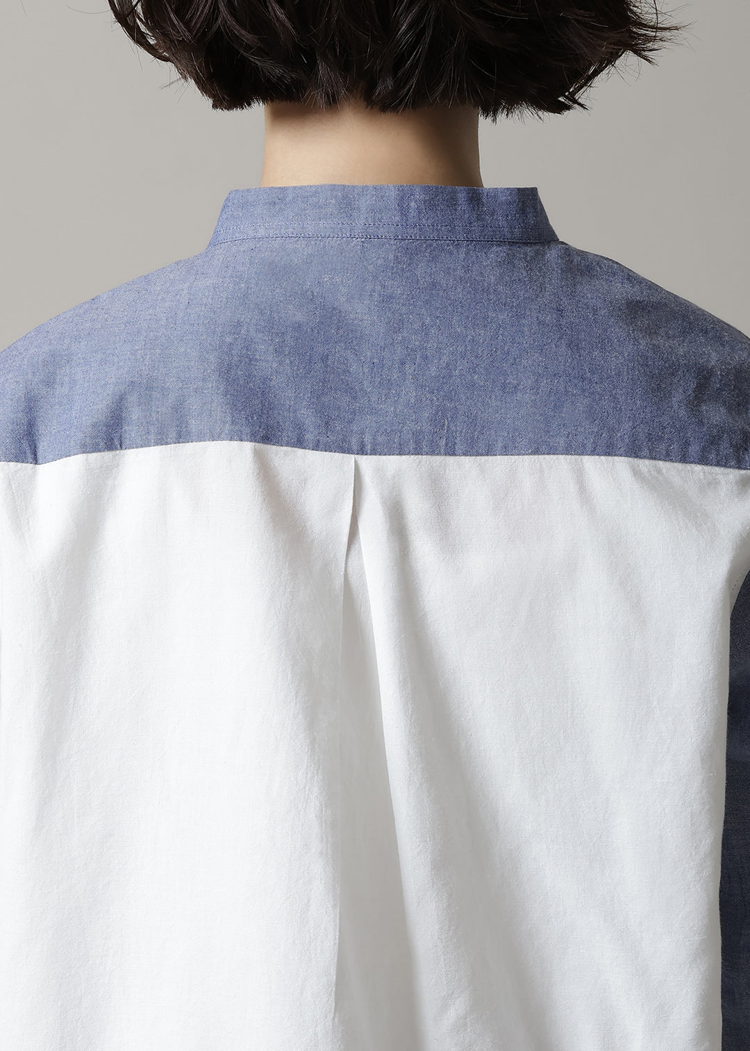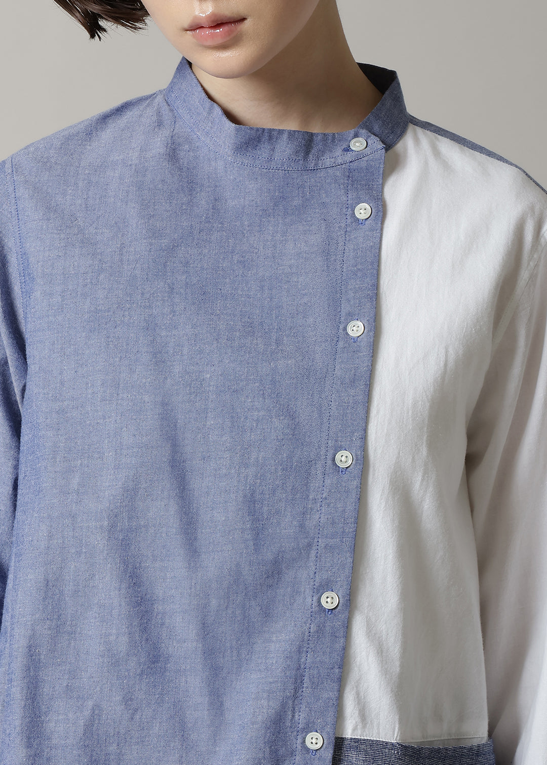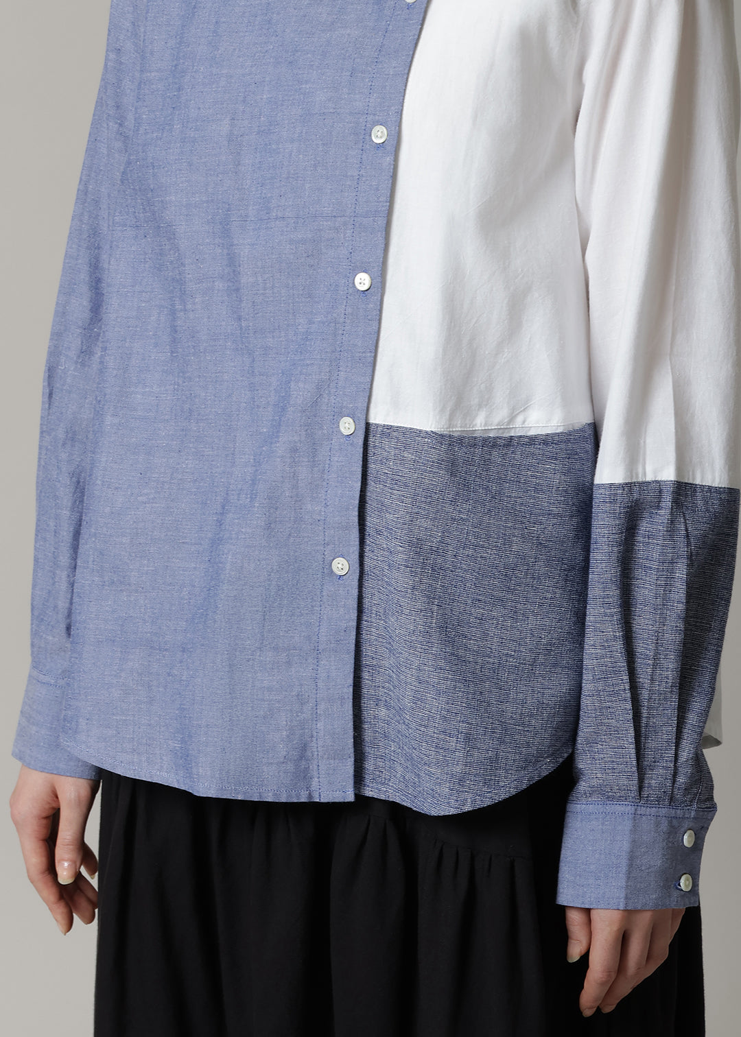 異なる生地感のカディを複数つなぎ合わせたアシンメトリーシャツです。