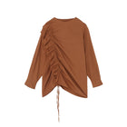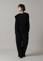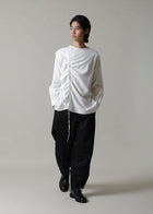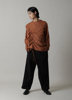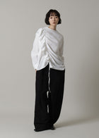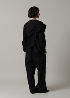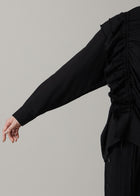 フリルは前後両方の身頃に施されており、バックスタイルにも華やかさを添える一枚。 ギャザー部分は紐で調整が可能で、たっぷりと寄せればフリルの立体感が際立ち、フェミニンな印象に。控えめに寄せれば、落ち着いた雰囲気で着用いただけます。