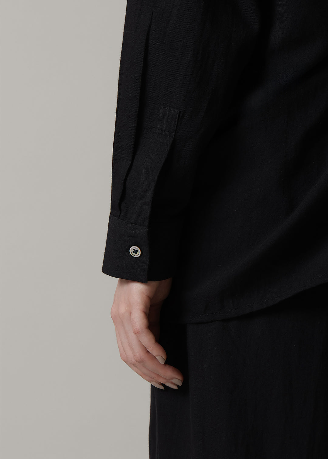インドの手紡ぎ・手織りのコットンツイル(あや織り)を使用しています。150番手の糸を2本取りした、滑らかで優しい肌ざわりが特徴です。光沢感のある上質な生地は、しっかりとした仕立てのため、長く着用いただけます。