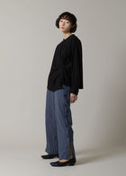 トップスは、ゆったりとしたシャツやニットの他、同素材のジャケットと合わせたセットアップ風の着こなしもおすすめです。裾の留め方も変えて、自由なスタイリングをお楽しみください。
