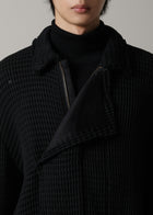 アシンメトリーのデザインに加え、袖や首回りにもレザーベルトを取り入れるなど、ディテールデザインにもこだわりました。最終的にはカジュアルとフォーマルの間の雰囲気に落とし込むことができ、羽織として、私は、一番好きなアイテムです。