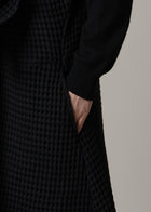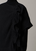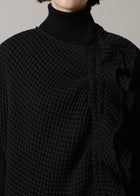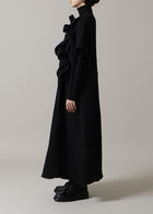 身頃のフリルと表情豊かな生地感が、シンプルなAラインのシルエットに華やかさを添える一枚。ギャザーの紐でフリルの調整が可能なため、たっぷりと寄せれば立体感が際立ち、フェミニンな印象に。控えめに寄せればより落ち着いた大人の雰囲気でご着用いただけます。