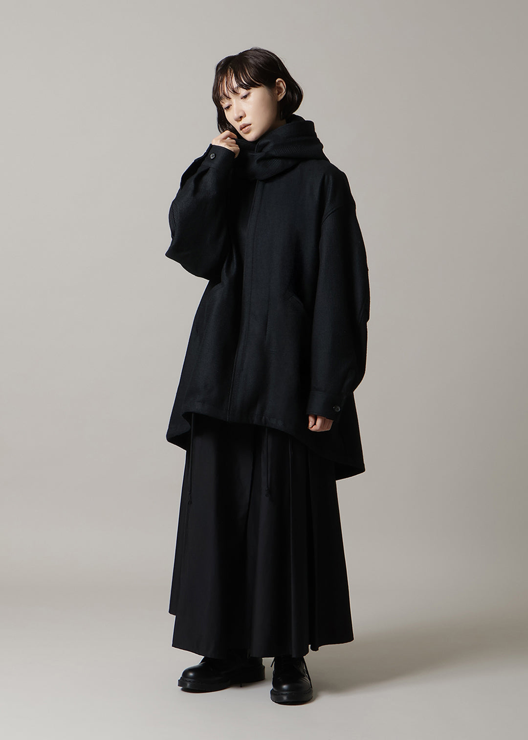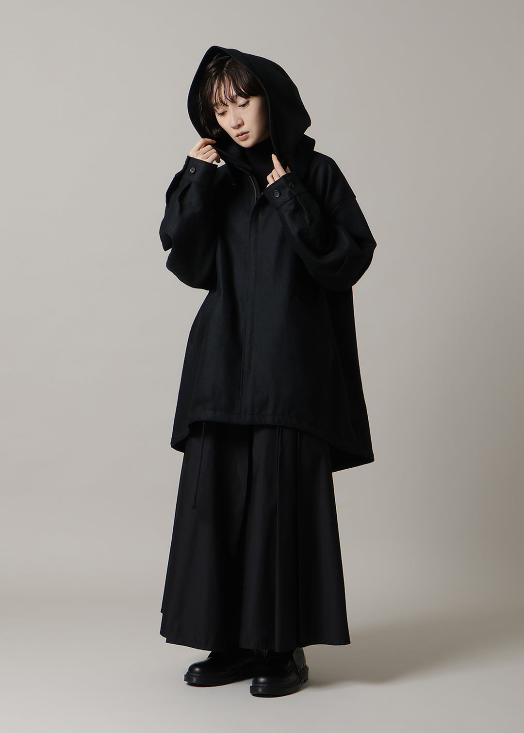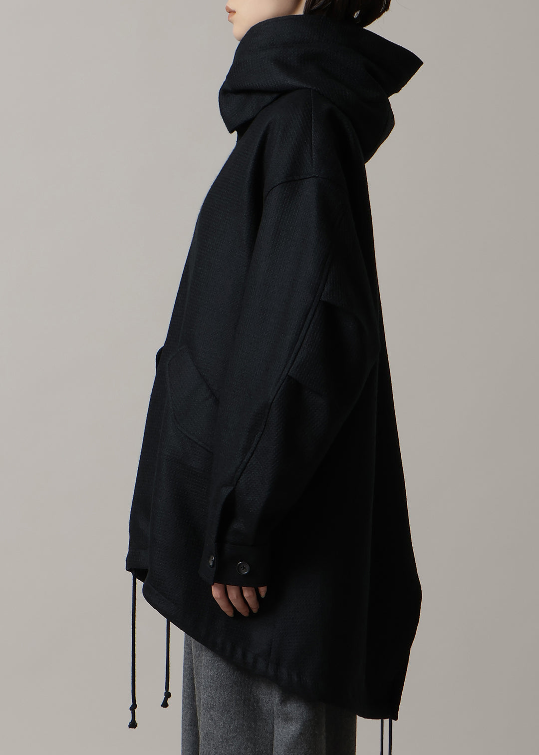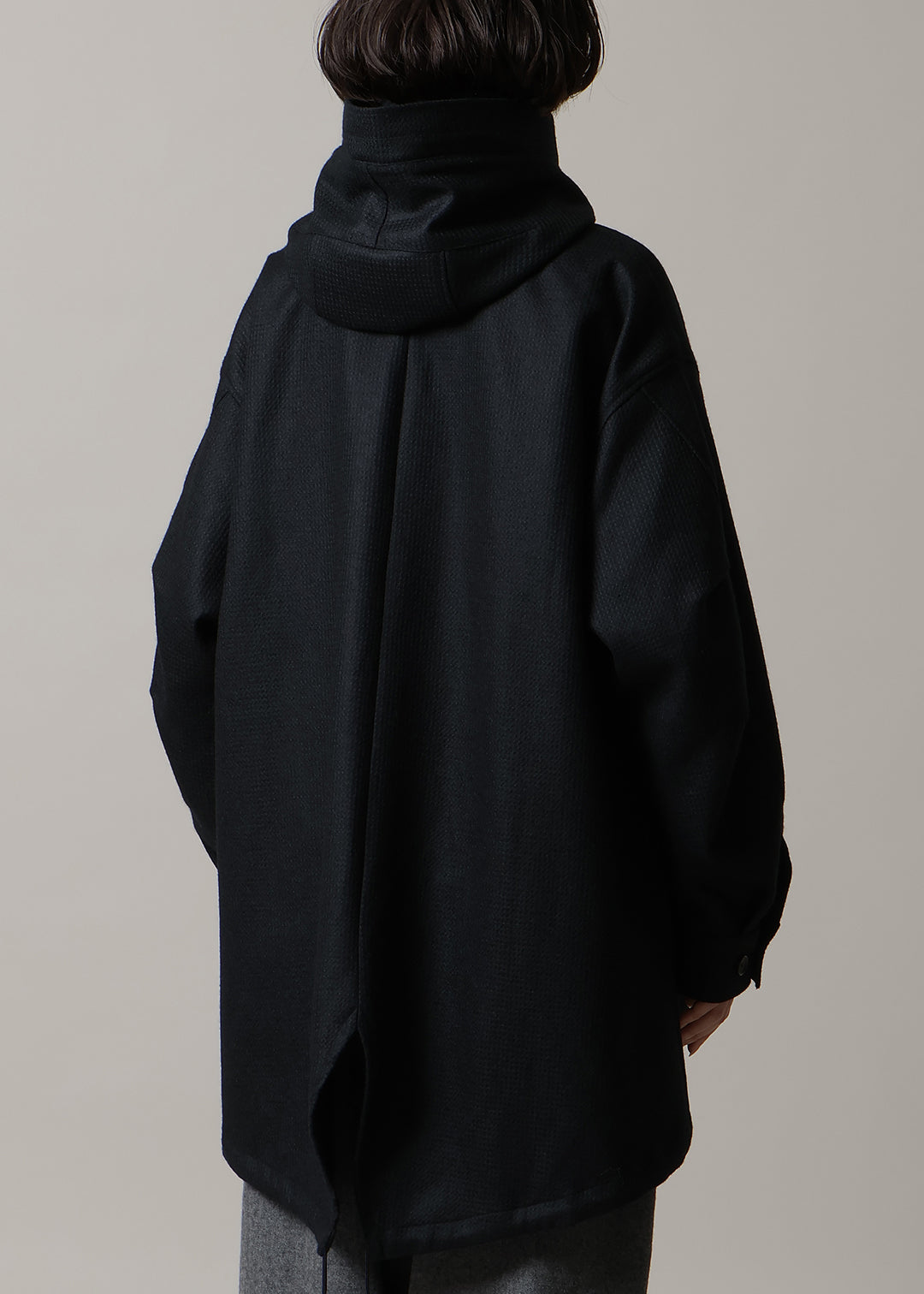 立体的な織り模様と、控えめなツヤのある素材感が魅力。リラックス感のあるデザインながら、洗練された雰囲気を醸し出す一着です。フードは取り外し可能で、スタンドカラーとしても楽しめる2WAY仕様。裾のドローコードを絞ることで、丸みのあるシルエットへの変化も楽しめます。
