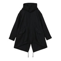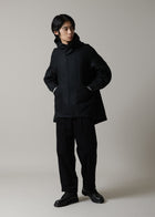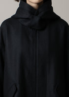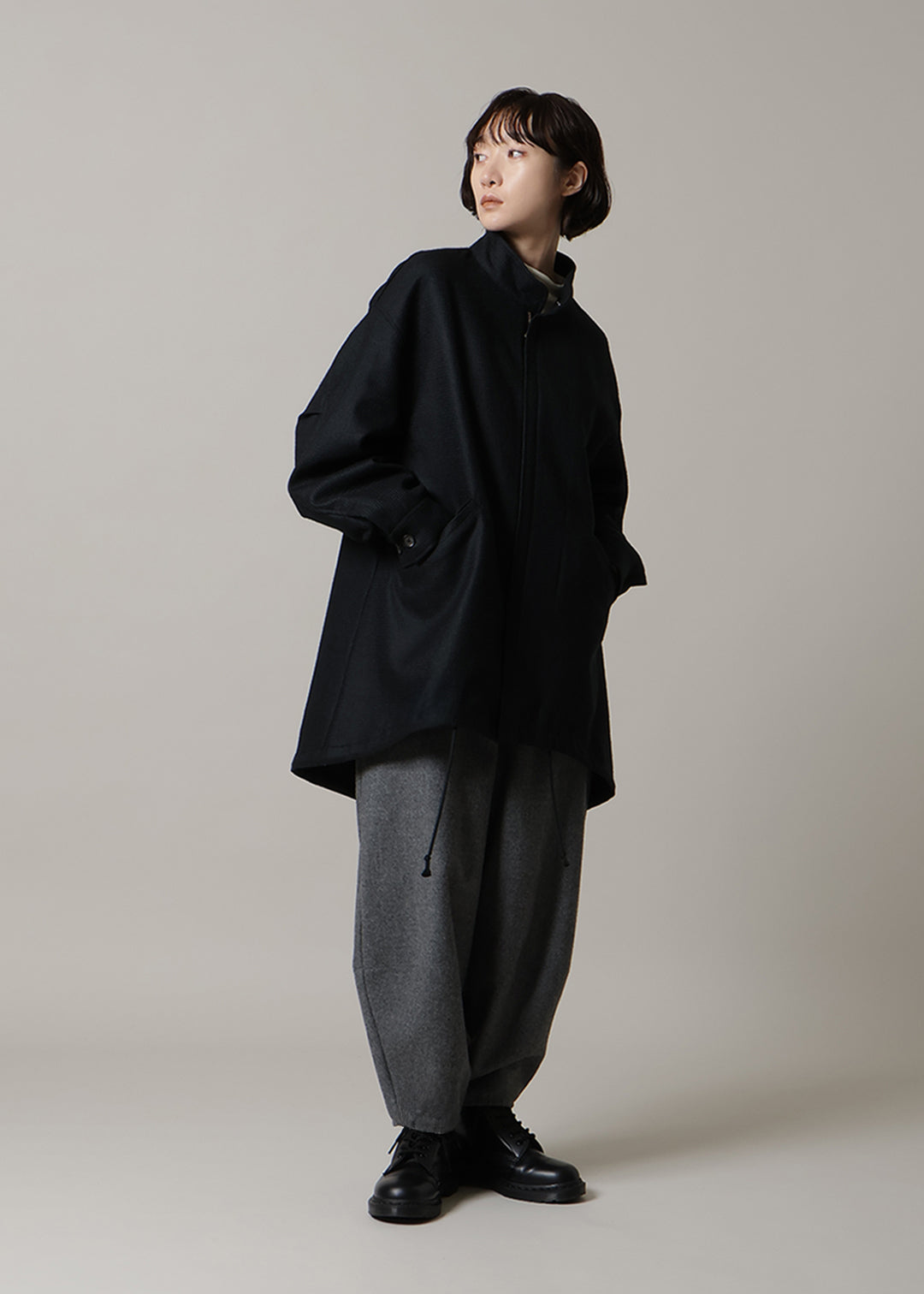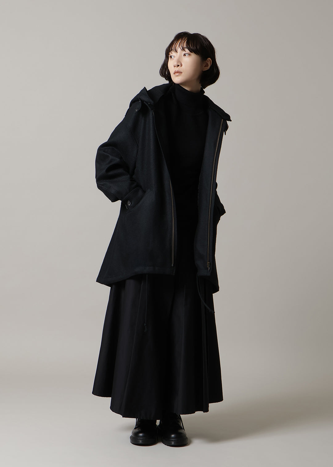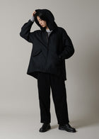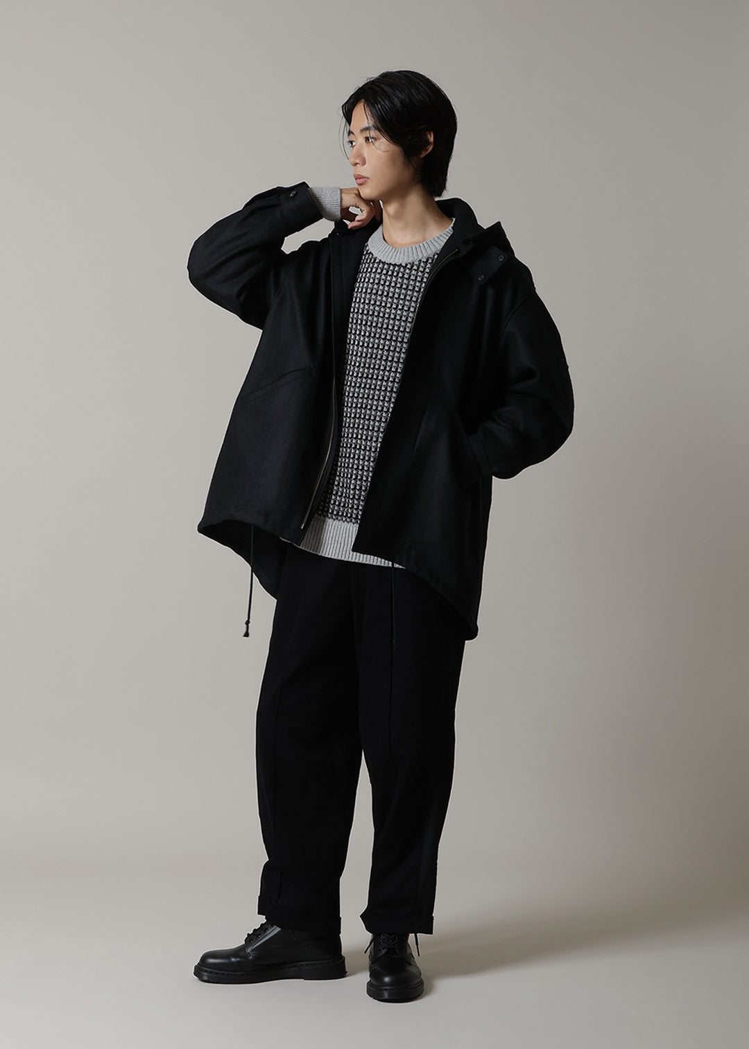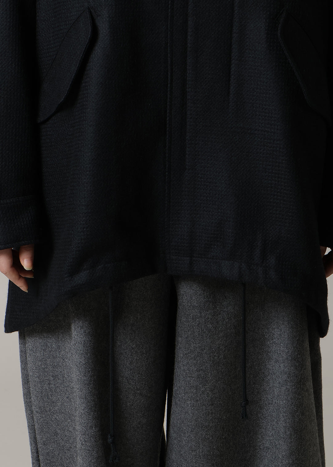 立体的な織り模様と、控えめなツヤのある素材感が魅力。リラックス感のあるデザインながら、洗練された雰囲気を醸し出す一着です。フードは取り外し可能で、スタンドカラーとしても楽しめる2WAY仕様。裾のドローコードを絞ることで、丸みのあるシルエットへの変化も楽しめます。