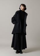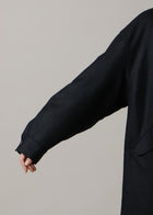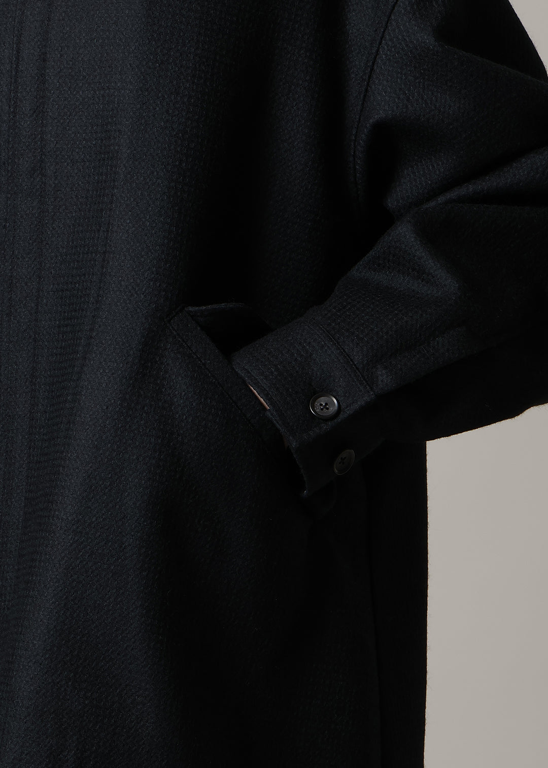 表面の豊かな表情が魅力の、ワッフル織りのウール生地です。光沢感のある極細の糸が織りなす立体的な模様が、シンプルなブラックの生地に独特の個性を演出します。重すぎず、しなやかでほどよい厚みの生地は、着心地も快適です。