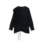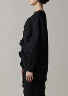 フリルは前後両方の身頃に施されており、バックスタイルにも華やかさを添える一枚。 ギャザー部分は紐で調整が可能で、たっぷりと寄せればフリルの立体感が際立ち、フェミニンな印象に。控えめに寄せれば、落ち着いた雰囲気で着用いただけます。