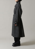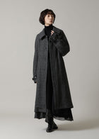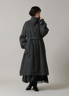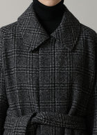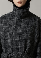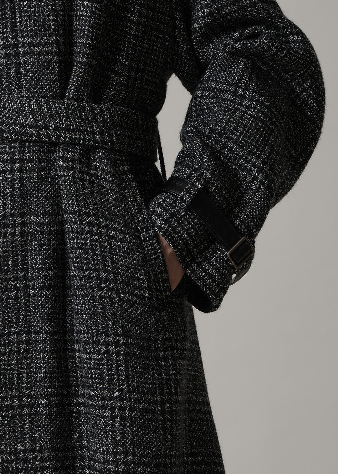 柔らかく上質なウール生地をたっぷりと使用しており、落ち着いたチェック模様と美しいシルエットが一枚で主役級の存在感を演出します。ベルトでウエストマークをしたり、ハイネックにするなど、着方で印象が大きく変化。袖口のレザーベルトは、絞ることで袖の長さ調節とボリューム感を生み出し、さりげないアクセントになります。