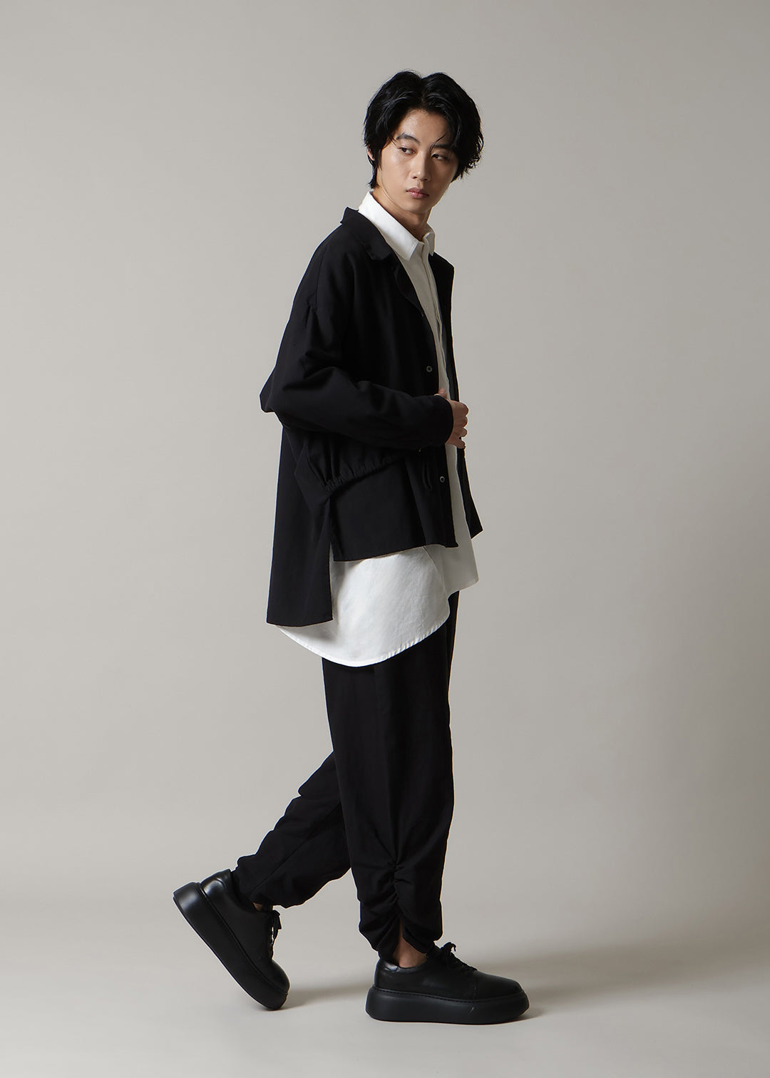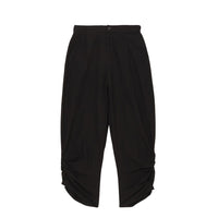 裾に施されたギャザーが、シンプルなスリムデザインにさりげないアクセントを添えます。着用時の脚のラインの美しさにこだわり、緻密なパターンで仕立てました。