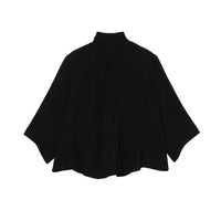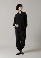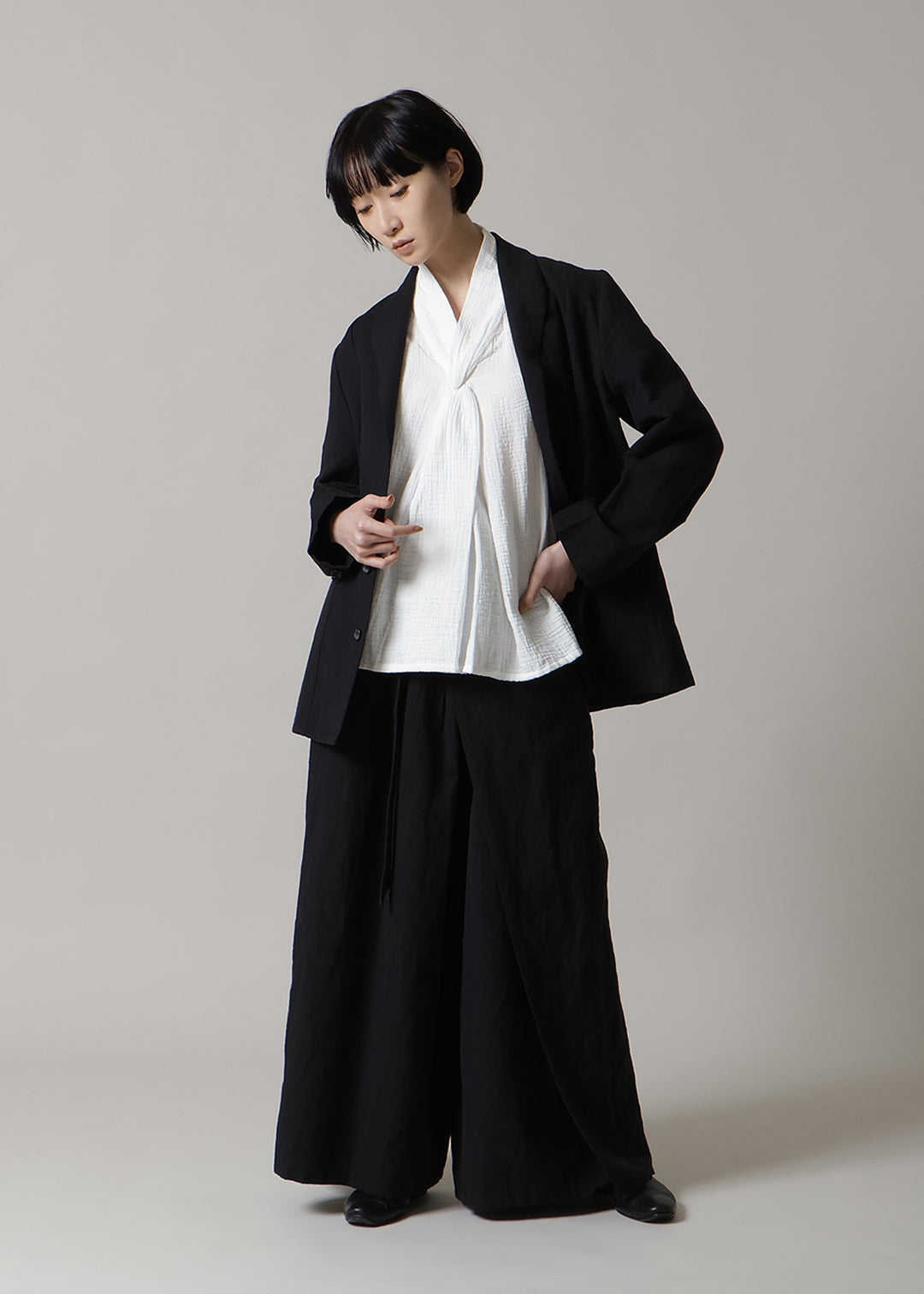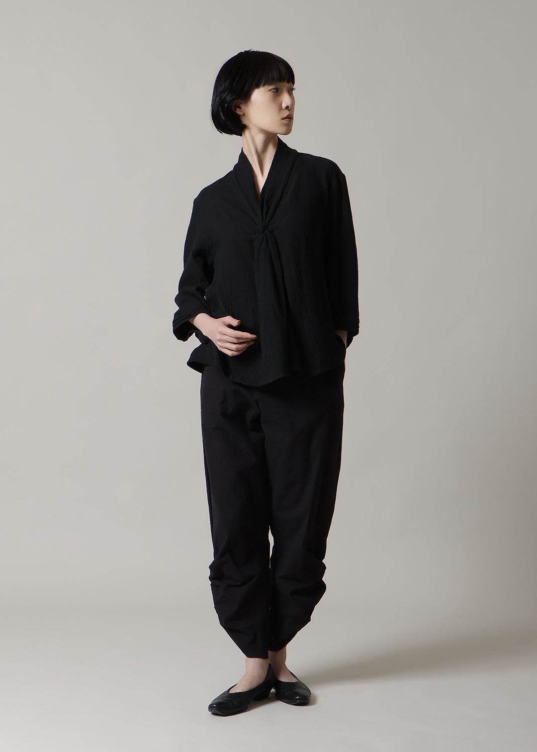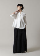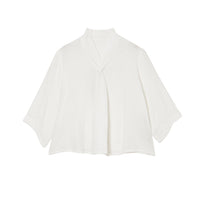 首元でクロスする襟のデザインが特徴で、顔周りにユニークで華やかなアクセントを添えます。袖に施したさりげないタックも、立体感を演出するこだわりのディテールです。 ゆったりとした身幅でリラックス感がありながら、着丈はジャストサイズに設計。どんなボトムスともバランスが取りやすい、着回し力の高さも魅力です。