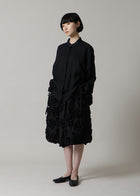 スカートに立体的に広がるたくさんの花は、ひも状の生地を使って一つ一つ手仕事で仕上げたもの。