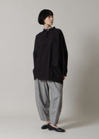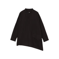 長めの着丈とゆとりのあるワイドシルエットが腰まわりをカバーし、リラックス感のある着心地に。大きめのポケットがアクセントとなり、左右非対称に仕立てた前合わせや裾のデザインがさりげない個性を引き立てます。カフスはダブルボタン仕様のため、袖まわりの調整が可能。