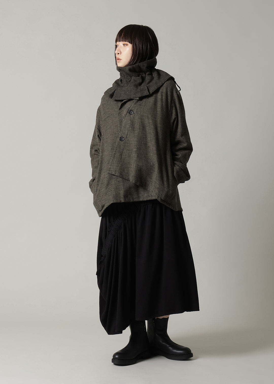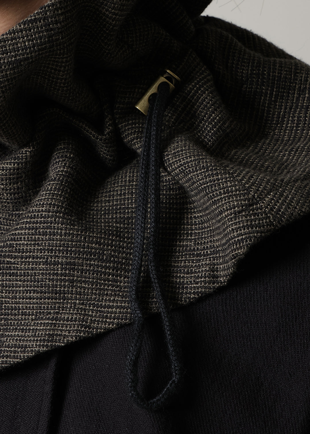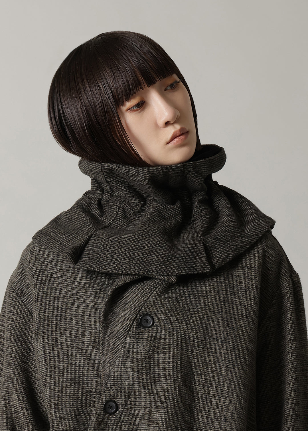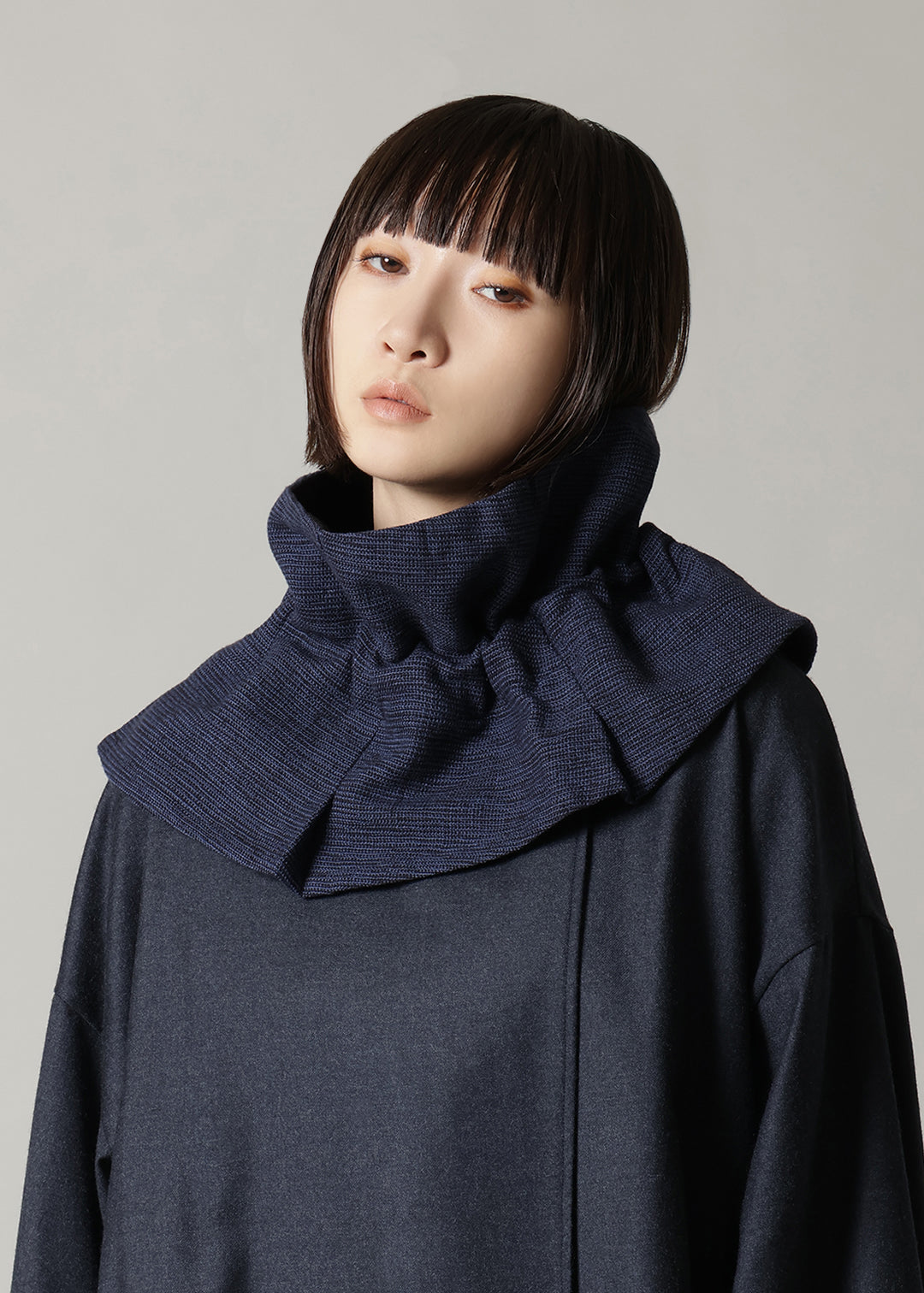 今季のアイテムにも使用している布帛の生地を活かし、自由に付け替え可能なコートの立ち襟のように仕立てました。