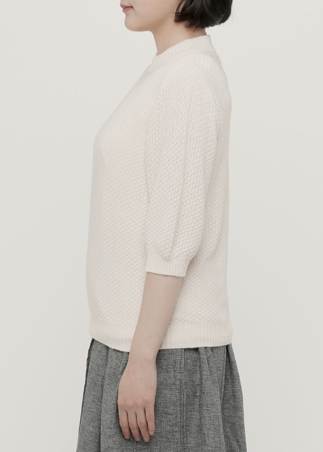 コットン糸で編み上げた、肌あたりのやわらかなコットンのプルオーバーです。立体感のある編み目がさりげないアクセントとなり、ベーシックな型ながら飽きがこないニットに仕上げました。お顔周りがすっきり見えるネックラインと、ゆったりとしたシルエットのバランスが美しく、スカートのフェミニンなコーディネートはもちろん、パンツと合わせたカジュアルスタイルも楽しんでいただけます。暑い時期でも着心地はさらりと快適に。冷房が効いた空間では体を冷えから守ってくれるアイテムです。自宅で手洗いができるのも嬉しいポイント。やわらかなコットン素材と落ち着いた明るいカラーで、ロングシーズン様々な場面で活躍してくれる一枚です。