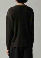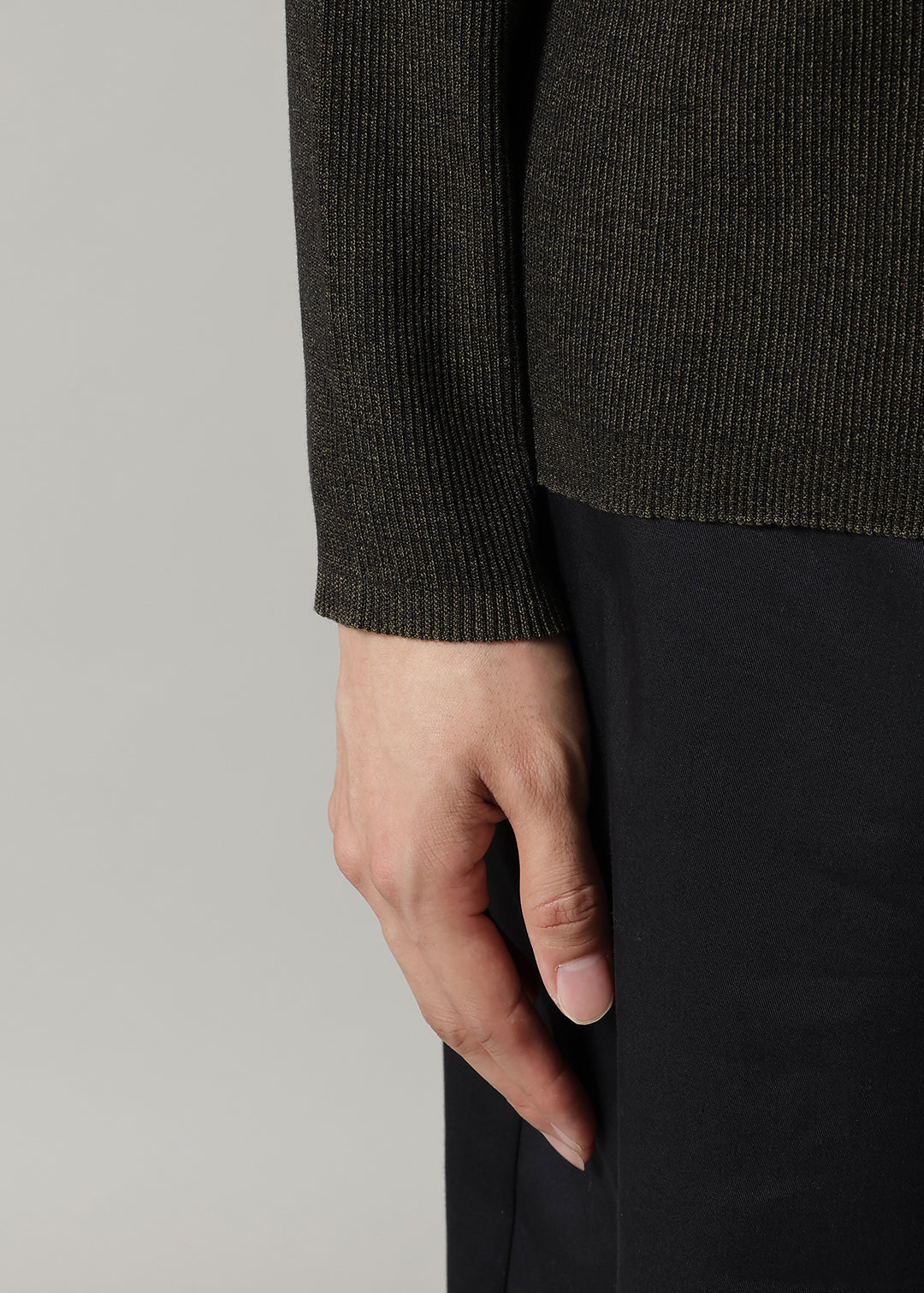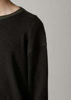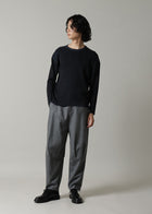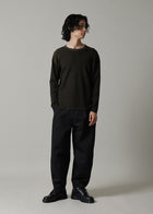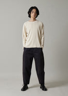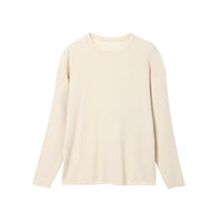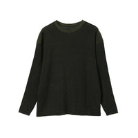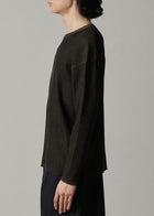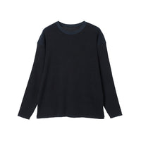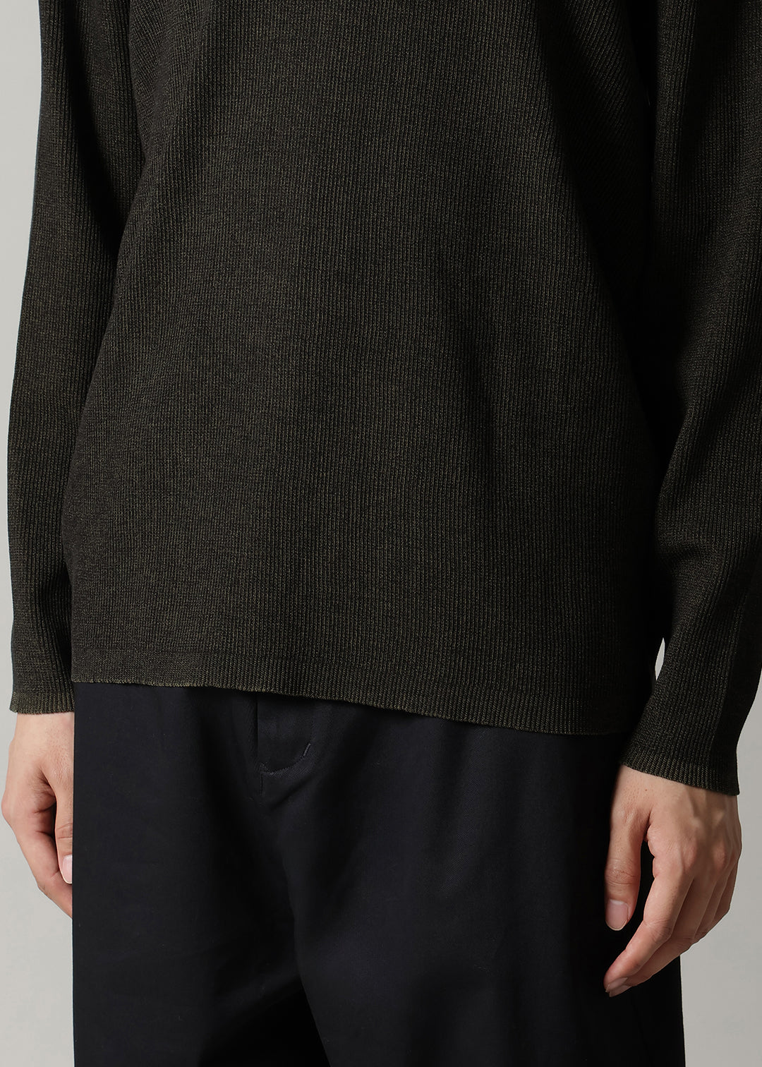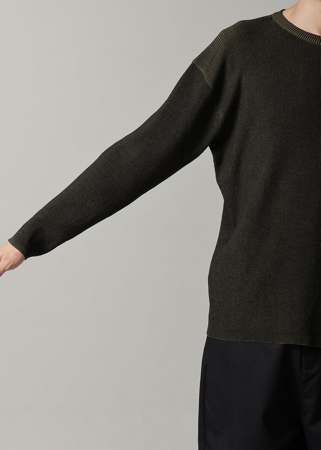 春夏の人気モデルをベースに、長袖のデザインが登場。ボックスシルエットにコンパクトなネックラインが、程よいゆとりがありつつ全体をすっきりとした印象に。 伸縮性のある生地はリブの上側と下側で異なる色の糸を使用し、リブが広がることで見える色合いが変化する、ユニークな一着に仕上がりました。