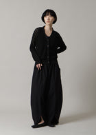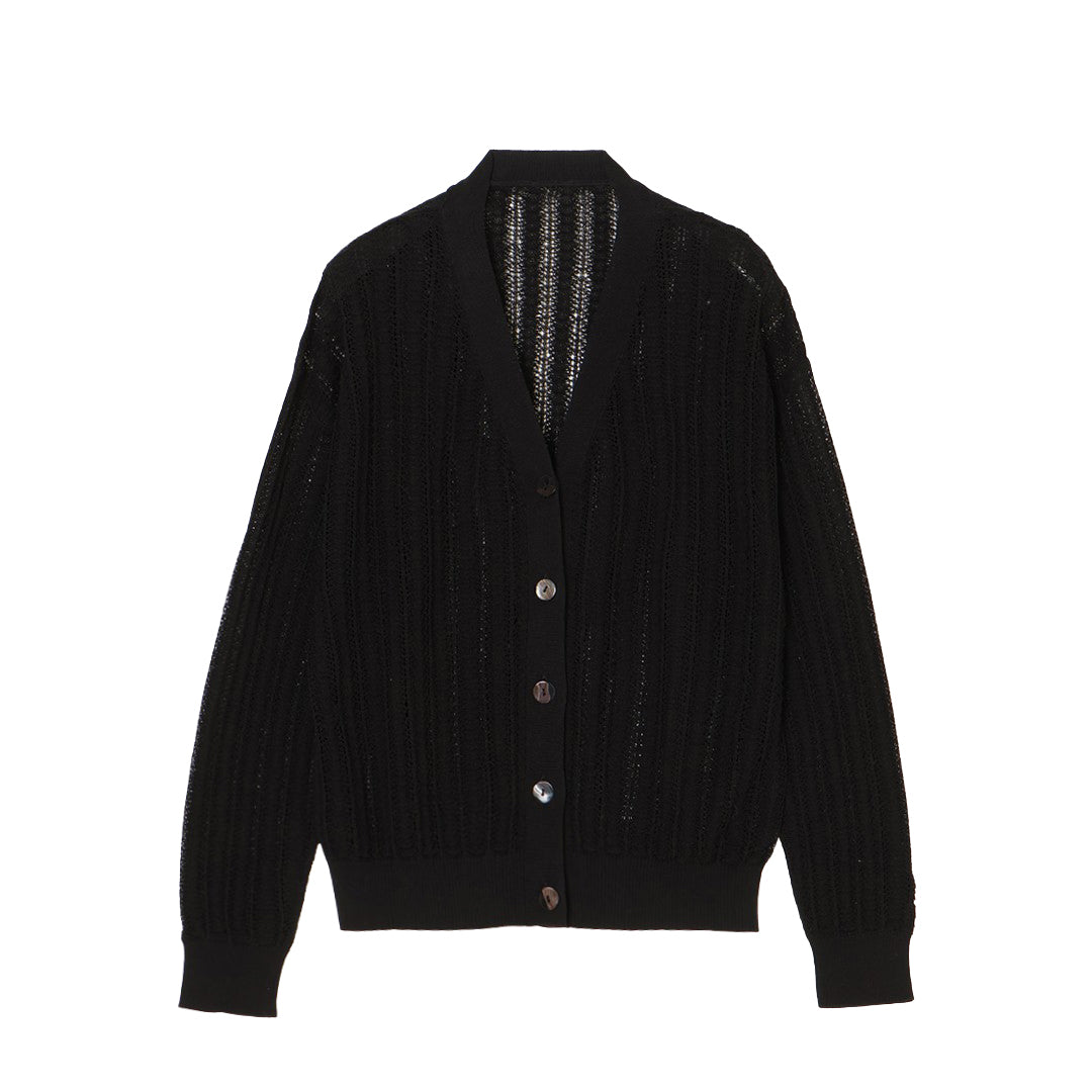 シアーな透け感と、繊細な編み模様、大きめのボタンがスタイリングにさりげないアクセントをプラスします。 ウエストが隠れる少し長めの丈感や、袖もゆったりとしたサイズ感のため、シックでありつつリラックス感のある印象に。