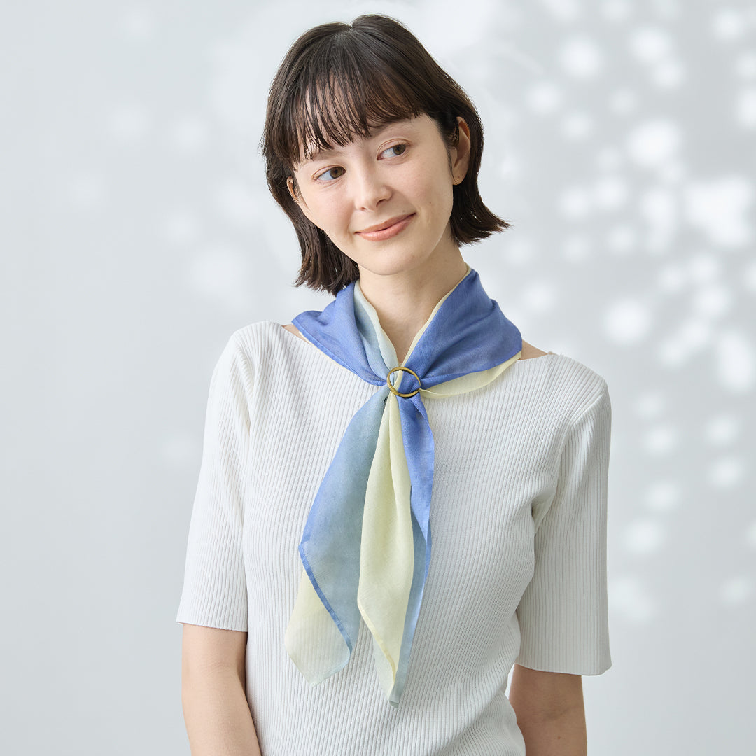 シルクとカシミヤで織り上げた、滑らかな肌触りのスカーフです。じっくりと染め重ねた美しいグラデーションは、イエローをベースにすることで肌馴染みが良く華やかな印象に。日常の装いに、洗練された抜け感と心地よさを添えます。専用のスカーフリング付で、気軽にスカーフコーデをお楽しみいただけます。