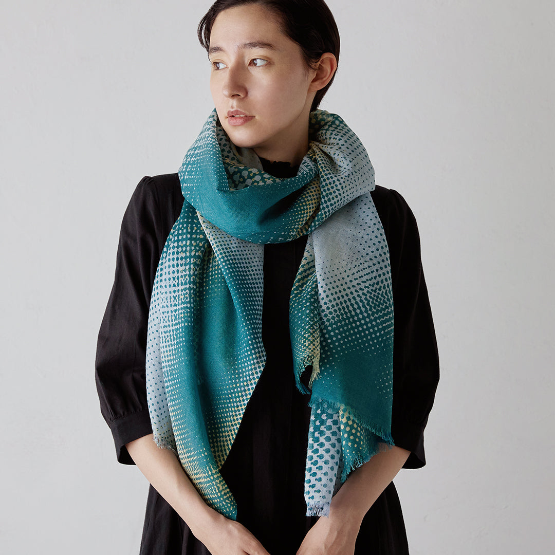 雨がぱらぱらと音を立てながら地面に広がる情景をイメージした、絵画のようなストールです。「手捺染」と呼ばれるスクリーンプリントで複数の色合いを美しく重ねることで、一粒一粒大きさの異なる雨粒を繊細に表現しました。