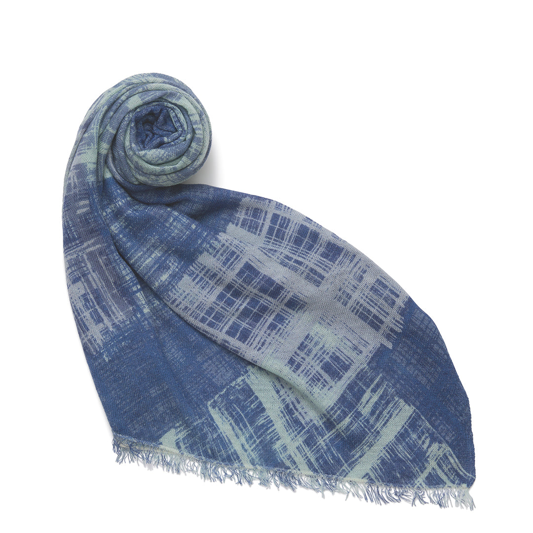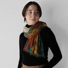 秋の訪れとともに、山々が美しく色づく自然の情景をストールで表現。「手捺染」と呼ばれるスクリーンプリントで複数の色合いを美しく重ね、緑の瑞々しさから紅葉に色めく様子をチェックや線などの幾何学的なパターンで繊細に描きました。