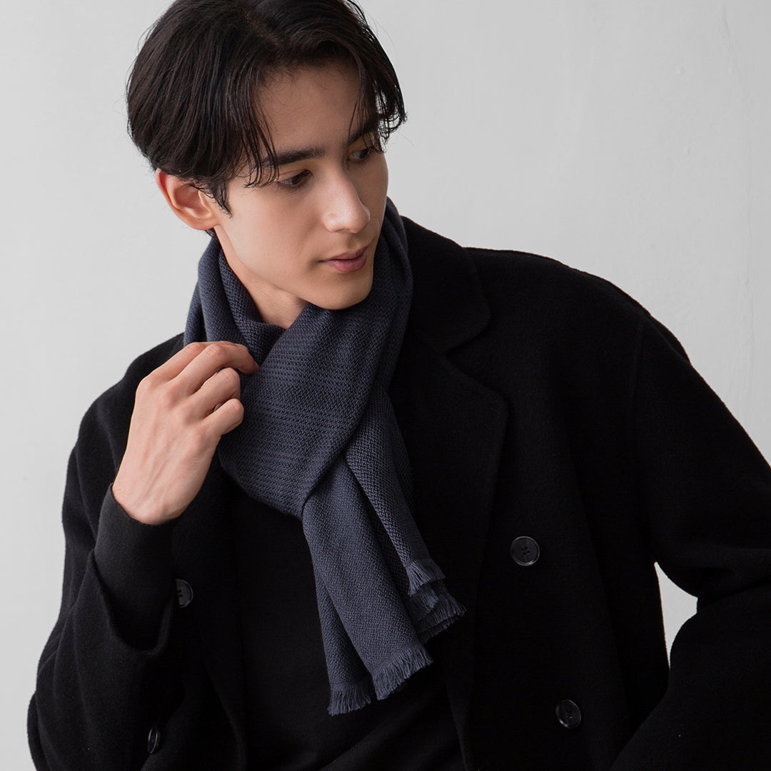 グレー・ネイビー・ブラウンと、ベーシックカラーに穏やかなグラデーションをかけた配色は、全体的に落ち着きとシックな印象を添える色合いに。 様々なお洋服にも合わせやすい色合いのため、カジュアルな場面にはもちろん、スーツなどのビジネスシーンにも合わせられる万能なストールです。