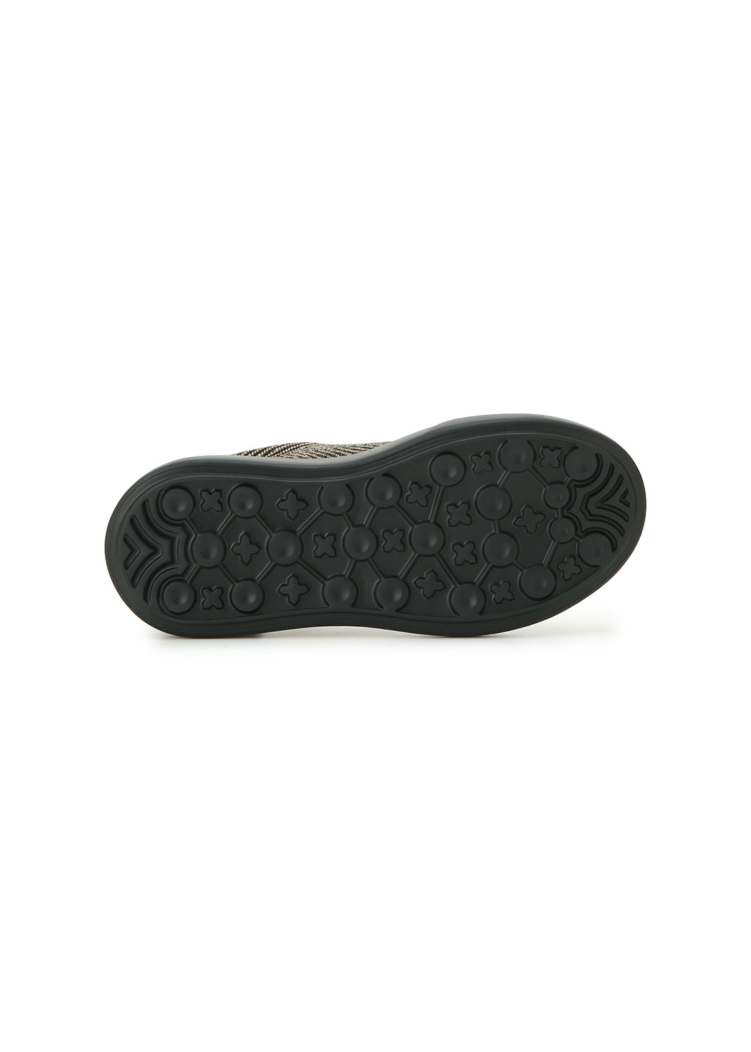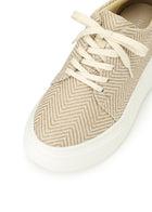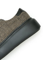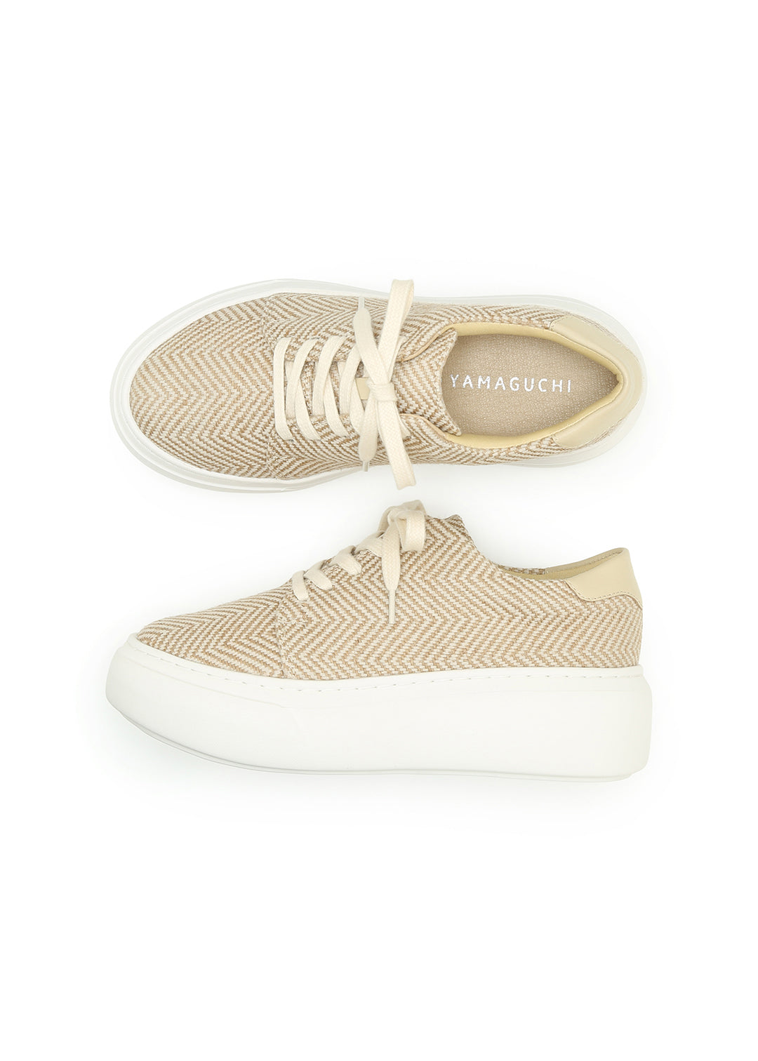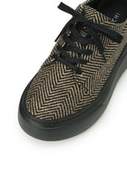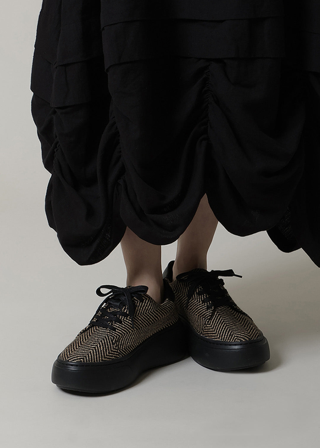 バングラデシュで"黄金の糸"と呼ばれたジュート。そのジュートをコットンと共に美しいヘリンボーン柄に織り上げ、シューズの素材として使用しました。