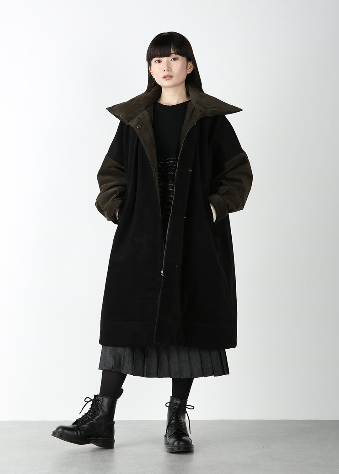 襟・前の見返し・裾・カフスの細部のパーツには、ポリエステルの中綿を使用。表面はあたたかなコーデュロイの生地を使用し、身頃や襟、袖のバイカラーデザインが目を引くアクセントに。カーキとブラックでカラーの切り替えが異なるため、印象の変化をお楽しみいただけます。