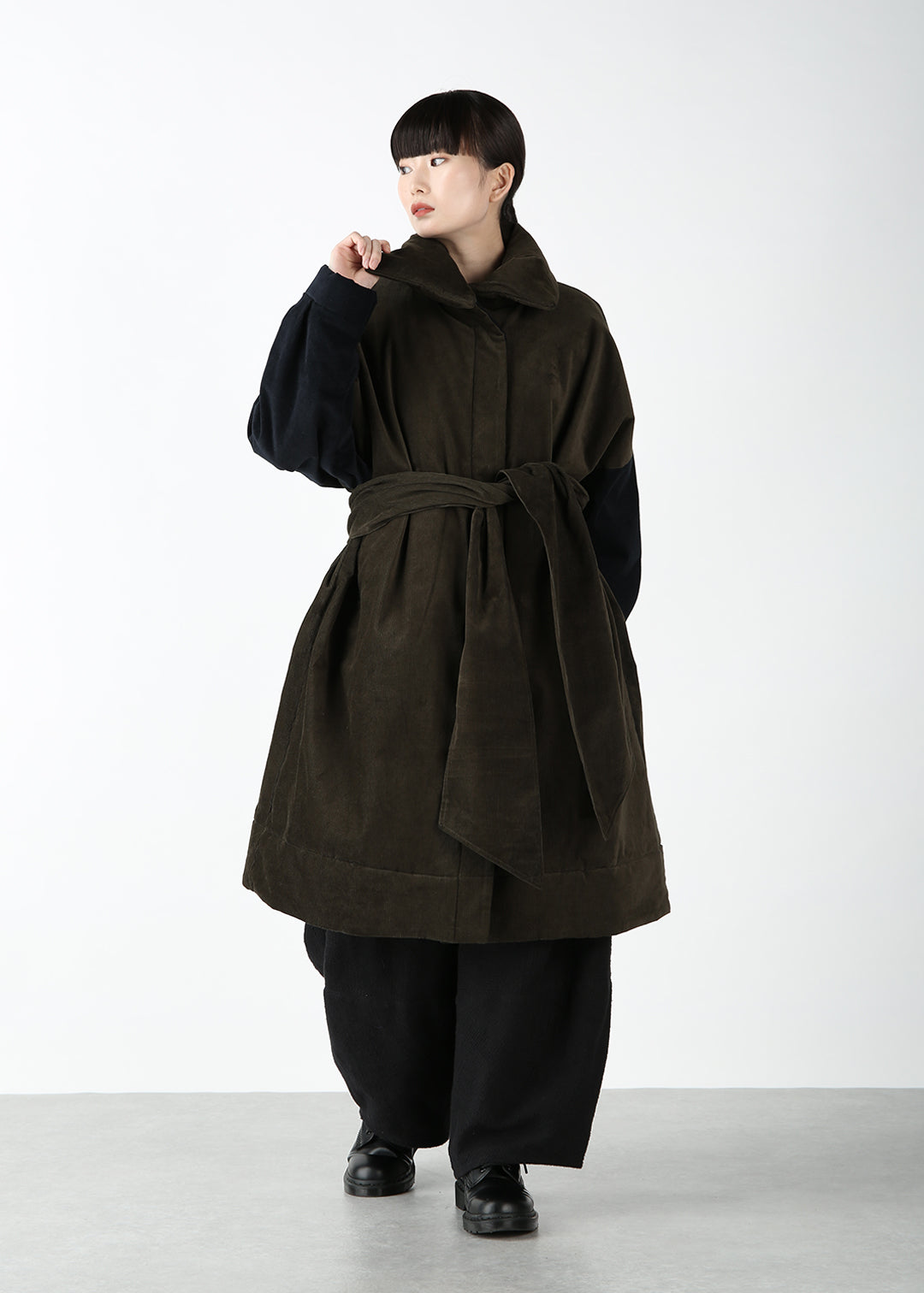 大きめの襟は立てて着用することで、洗練されたモードな雰囲気を演出。また、同布で仕立てたウエストのベルトを結ぶことでスタイリングにメリハリが加わるため、シルエットに変化をつけての着用もおすすめです。