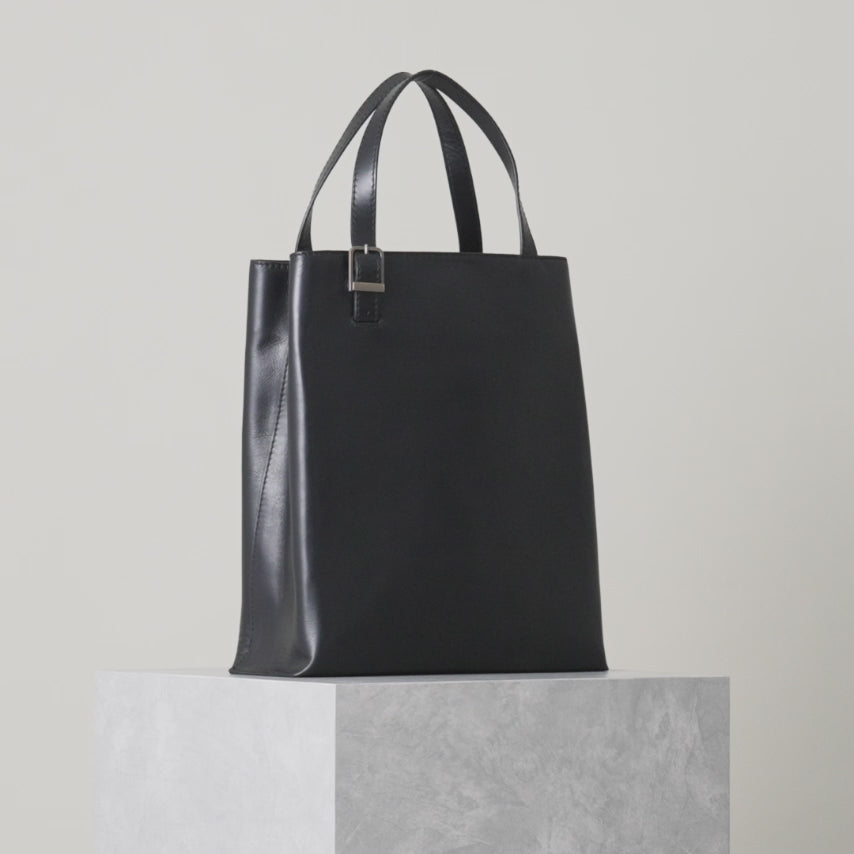 艶やかなレザーが引き立つ、ミニマルなシルエットの縦型トートバック