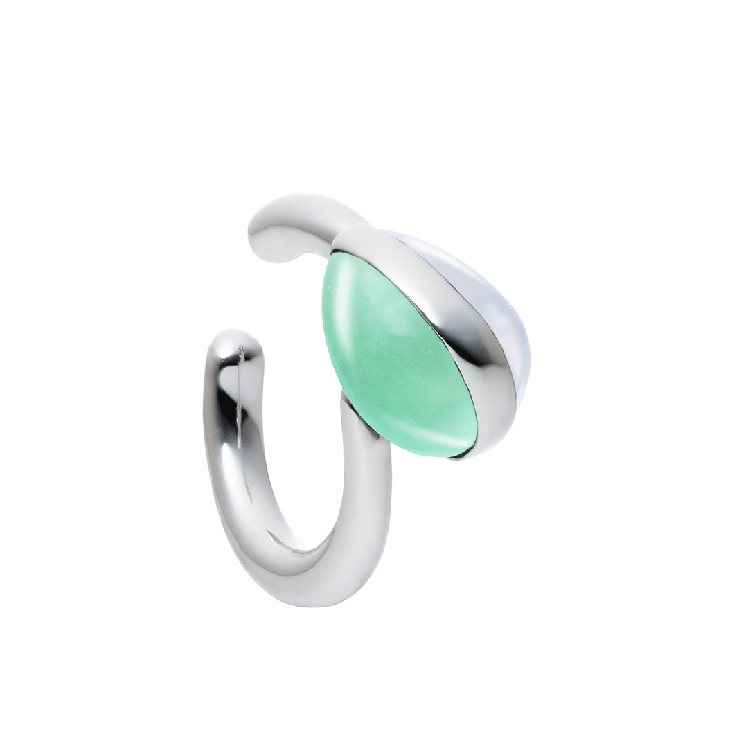 相反する2色の石がひとつになり、お互いの輝きを引き立てあうDay and Night Shizukuにイヤーカフが登場。カボッションカットを施した2つの天然石をミニマムなシルバーで留め、しずくを表現しました。 2色のコントラストが光るカラーストーンがポイントの、シャープな印象を演出するイヤーカフです。